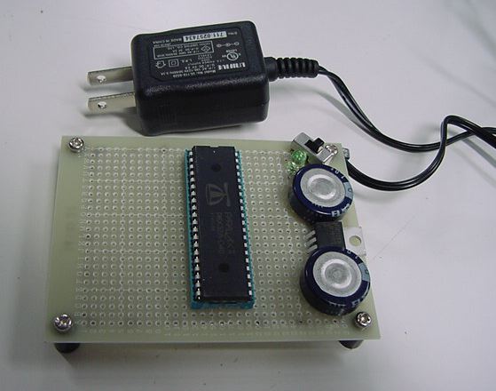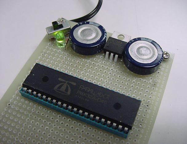 新学期の準備に追われているうちに午後になり、昨日注文していた水晶も届いた。 とりあえず、オリジナルのPropeller回路が動くかどうかまでは、作って実験してみよう。 まずは電源である。 マルツの小型スイッチングACアダプタの「+5V 2A」を使って、 +5Vラインは3端子レギュレータでなく直接、この出力が使えないか、試してみることにした。 +5Vを受けて3.3Vにしているのは、LM3940である。 パスコンは、参考回路図には「1000μF」とあったが、たまたま手元に「1F」という強烈なのがあったので、 これを+5Vと+3.3Vのラインに入れて、積層セラミックコンデンサの105をここにパラってみた。とりあえず電圧はちゃんと出たので、Propellerマニュアルにあった、 以下の回路図に従って、シリアルEEPROMとPropellerクリップを接続してみた。