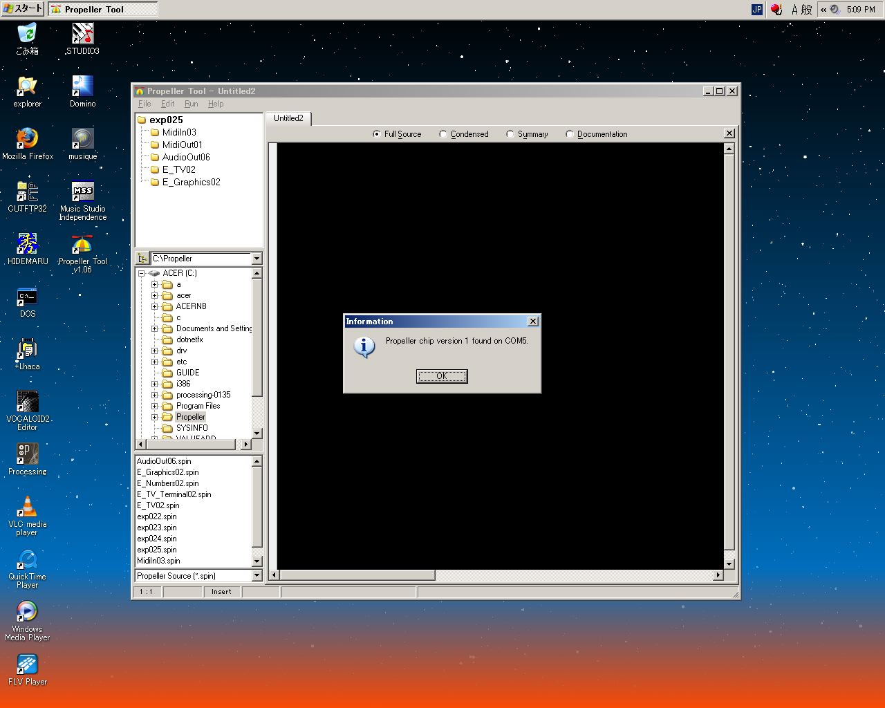 ここでとりあえず、パソコンPropeller Toolに移動して、 これまで使っていたPropeller Demo BoardからUSBケーブルを外して、 この試作基板に接続されたPropellerクリップに繋いでみた。 すると、WindowsはこちらにのPropellerクリップも、自動的に新しいハードウェアとして認識した。 そしてPropeller Toolのハードウェア認識メニューを走らせると、 以下のように、これまでのCOM4から新しいCOM5となって、無事に認識した。