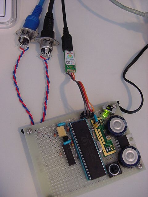 まず最初に、Propeller Demo Boardのブレッドボード領域に製作した、 以下のMIDI IN回路とMIDI OUT回路とを、この新しい試作基板の上に作ってみた。