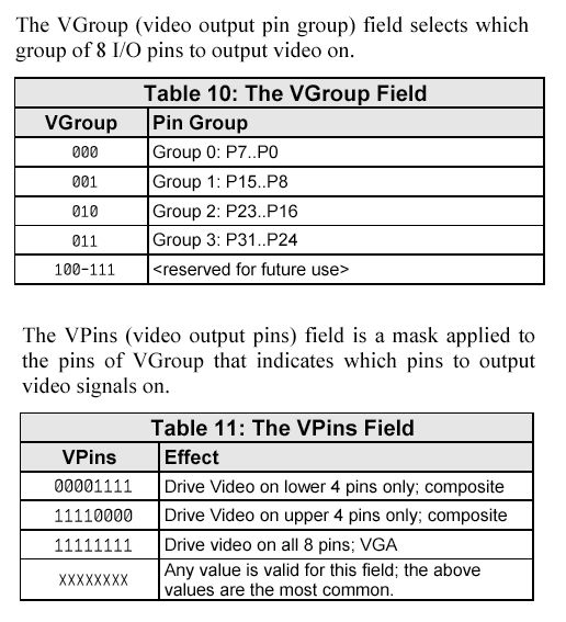 ・・・・・・・・ ''VAR 'TV parameters - 14 contiguous longs '' long tv_status '0/1/2 = off/invisible/visible read-only '' long tv_enable '0/non-0 = off/on write-only '' long tv_pins '%pppmmmm = pin group, pin group mode write-only '' long tv_mode '%tccip = tile,chroma,interlace,ntsc/pal write-only '' long tv_screen 'pointer to screen (words) write-only '' long tv_colors 'pointer to colors (longs) write-only '' long tv_ht 'horizontal tiles write-only '' long tv_vt 'vertical tiles write-only '' long tv_hx 'horizontal tile expansion write-only '' long tv_vx 'vertical tile expansion write-only '' long tv_ho 'horizontal offset write-only '' long tv_vo 'vertical offset write-only '' long tv_broadcast 'broadcast frequency (Hz) write-only '' long tv_auralcog 'aural fm cog write-only ''The preceding VAR section may be copied into your code. ''After setting variables, do start(@tv_status) to start driver. ''All parameters are reloaded each superframe, allowing you to make live ''changes. To minimize flicker, correlate changes with tv_status. ''Experimentation may be required to optimize some parameters. ''Parameter descriptions: ・・・・・・・・ '' tv_pins '' '' bits 6..4 select pin group: '' %000: pins 7..0 '' %001: pins 15..8 '' %010: pins 23..16 '' %011: pins 31..24 '' %100: pins 39..32 '' %101: pins 47..40 '' %110: pins 55..48 '' %111: pins 63..56 '' '' bits 3..0 select pin group mode: '' %0000: %0000_0111 - baseband '' %0001: %0000_0111 - broadcast '' %0010: %0000_1111 - baseband + chroma '' %0011: %0000_1111 - broadcast + aural '' %0100: %0111_0000 broadcast - '' %0101: %0111_0000 baseband - '' %0110: %1111_0000 broadcast + aural - '' %0111: %1111_0000 baseband + chroma - '' %1000: %0111_0111 broadcast baseband '' %1001: %0111_0111 baseband broadcast '' %1010: %0111_1111 broadcast baseband + chroma '' %1011: %0111_1111 baseband broadcast + aural '' %1100: %1111_0111 broadcast + aural baseband '' %1101: %1111_0111 baseband + chroma broadcast '' %1110: %1111_1111 broadcast + aural baseband + chroma '' %1111: %1111_1111 baseband + chroma broadcast + aural '' ----------------------------------------------------------- '' active pins top nibble bottom nibble '' '' the baseband signal nibble is arranged as: '' bit 3: chroma signal for s-video (attach via 560-ohm resistor) '' bits 2..0: baseband video (sum 270/560/1100-ohm resistors to form 75-ohm 1V signal) '' '' the broadcast signal nibble is arranged as: '' bit 3: aural subcarrier (sum 560-ohm resistor into network below) '' bits 2..0: visual carrier (sum 270/560/1100-ohm resistors to form 75-ohm 1V signal)これによれば、Propeller Demo BoardのP12-14では、 「%001_0101」というのは、ppp=%001、mmmm=%0101、ということになる。 確かに「pins 15..8」のグループなので、おそらくモードは「baseband」なのだろうと推定した。 さて問題は、ビデオ出力(A)では、同じ「pins 15..8」のグループで、上位4ビットでなくて、 下位41ビットに移動したいのである。 つまり、ppp=%001は同じ筈であり、mmmmをどこにするか、という事になる。