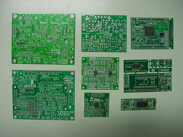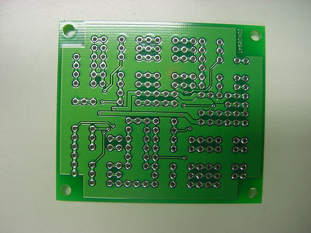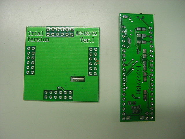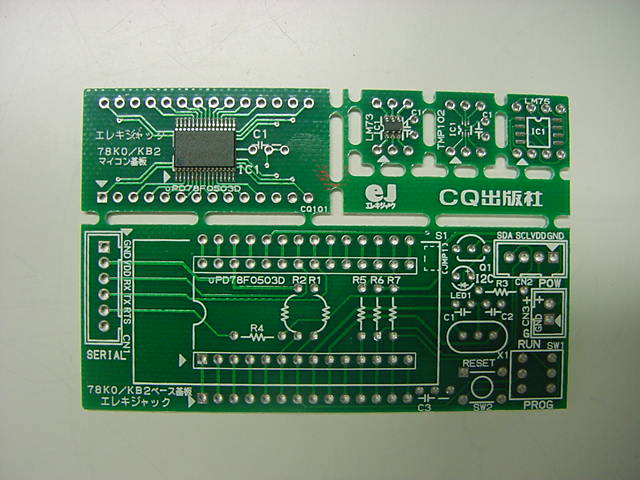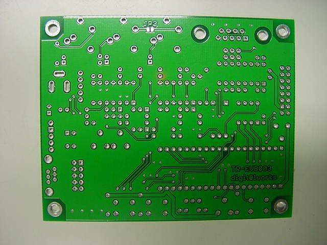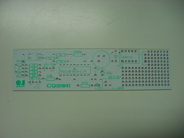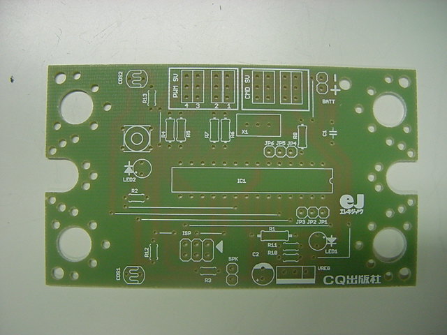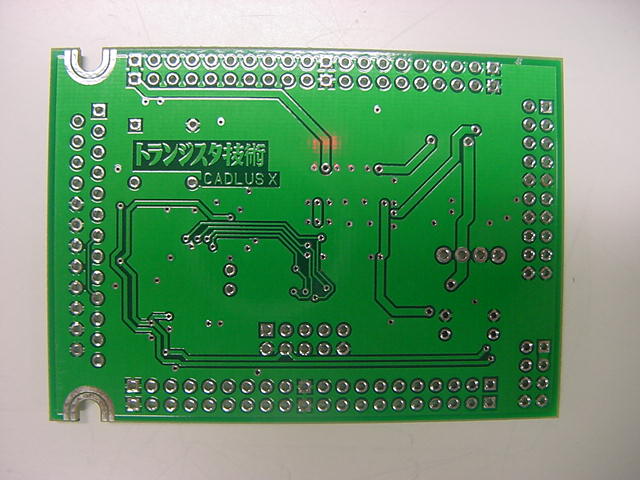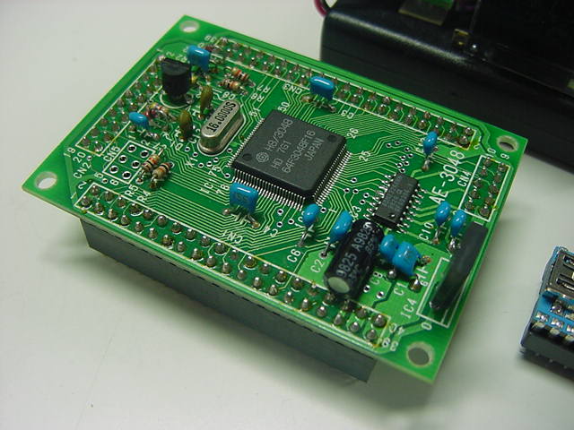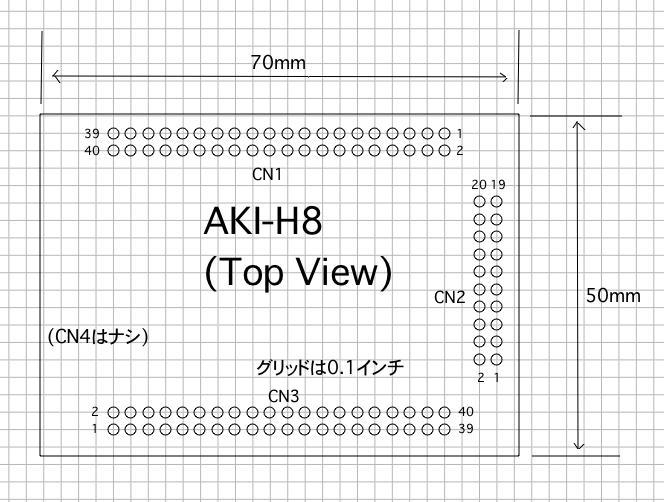 基板の4辺にあるコネクタのうち、CN1からCN3までの3個は基板の下に普通に2列ピンヘッダ(オス)で出すが、書き込みポートのあるCN4(10ピン)だけは、基板の上に2列10ピンのピンヘッダ(オス)で出す。ここに自作のAKI-H8ライタを接続してファームウエェアを書き込む。この際には+9Vが"Power"ラインにかかるので注意。書き込み時にはシステムの+5Vラインは生かしておくこと- ディジタル出力ポートの電圧(+5Vか+3.3Vか)