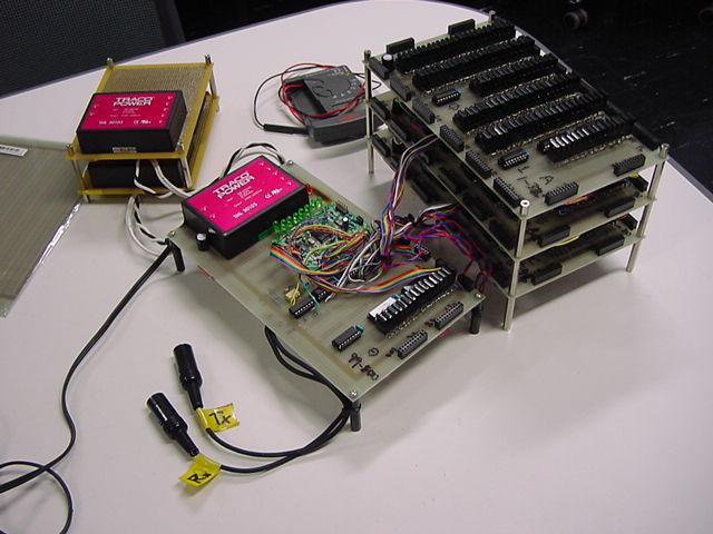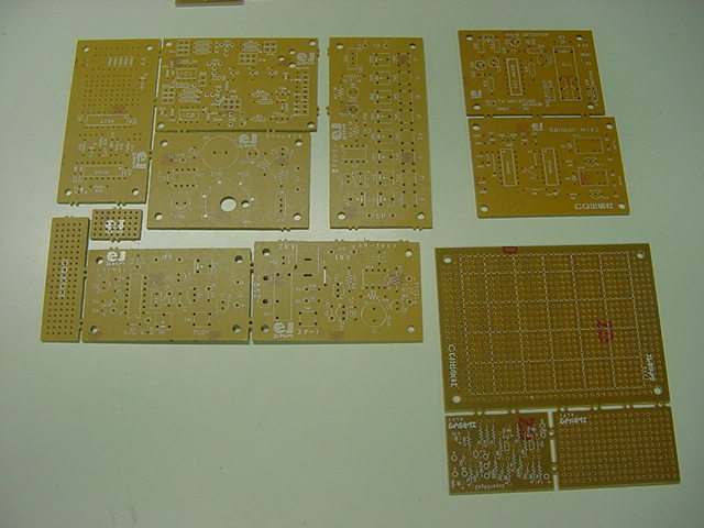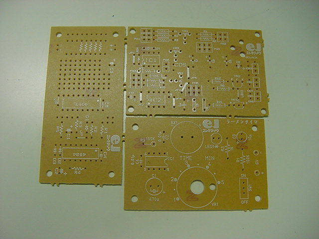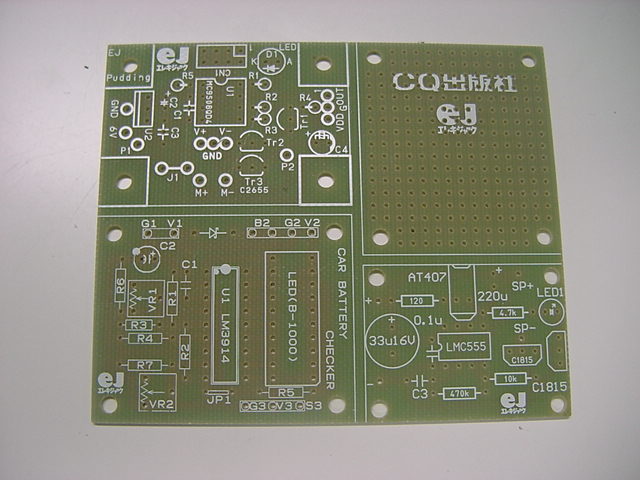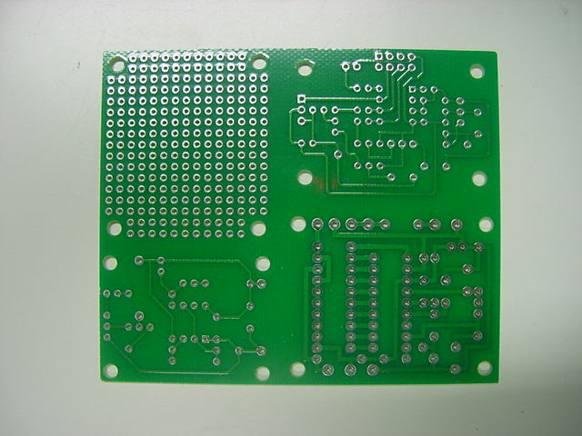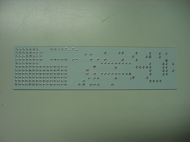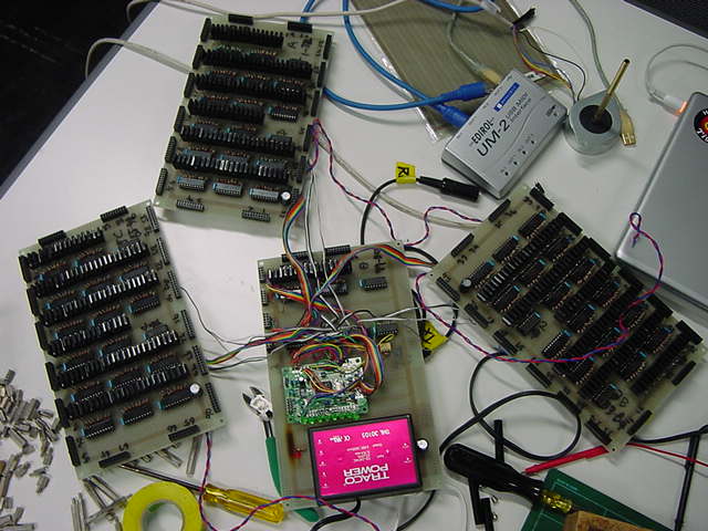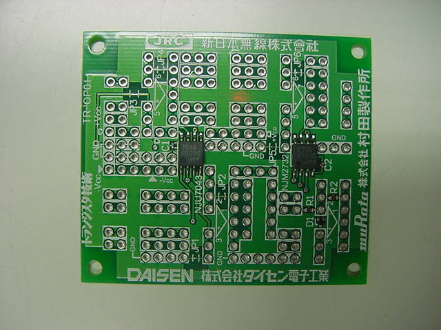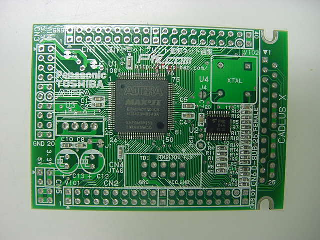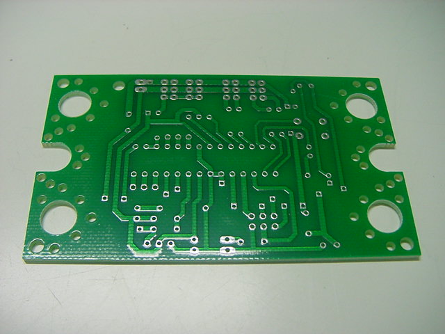 基板の4辺にあるコネクタのうち、CN1からCN3までの3個は基板の下に普通に2列ピンヘッダ(オス)で出すが、書き込みポートのあるCN4(10ピン)だけは、基板の上に2列10ピンのピンヘッダ(オス)で出す。ここに自作のAKI-H8ライタを接続してファームウエェアを書き込む。この際には+9Vが"Power"ラインにかかるので注意。書き込み時にはシステムの+5Vラインは生かしておくこと- ディジタル出力ポートの電圧(+5Vか+3.3Vか)