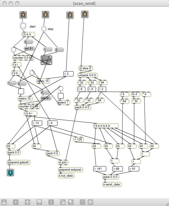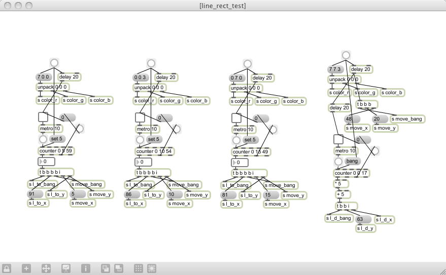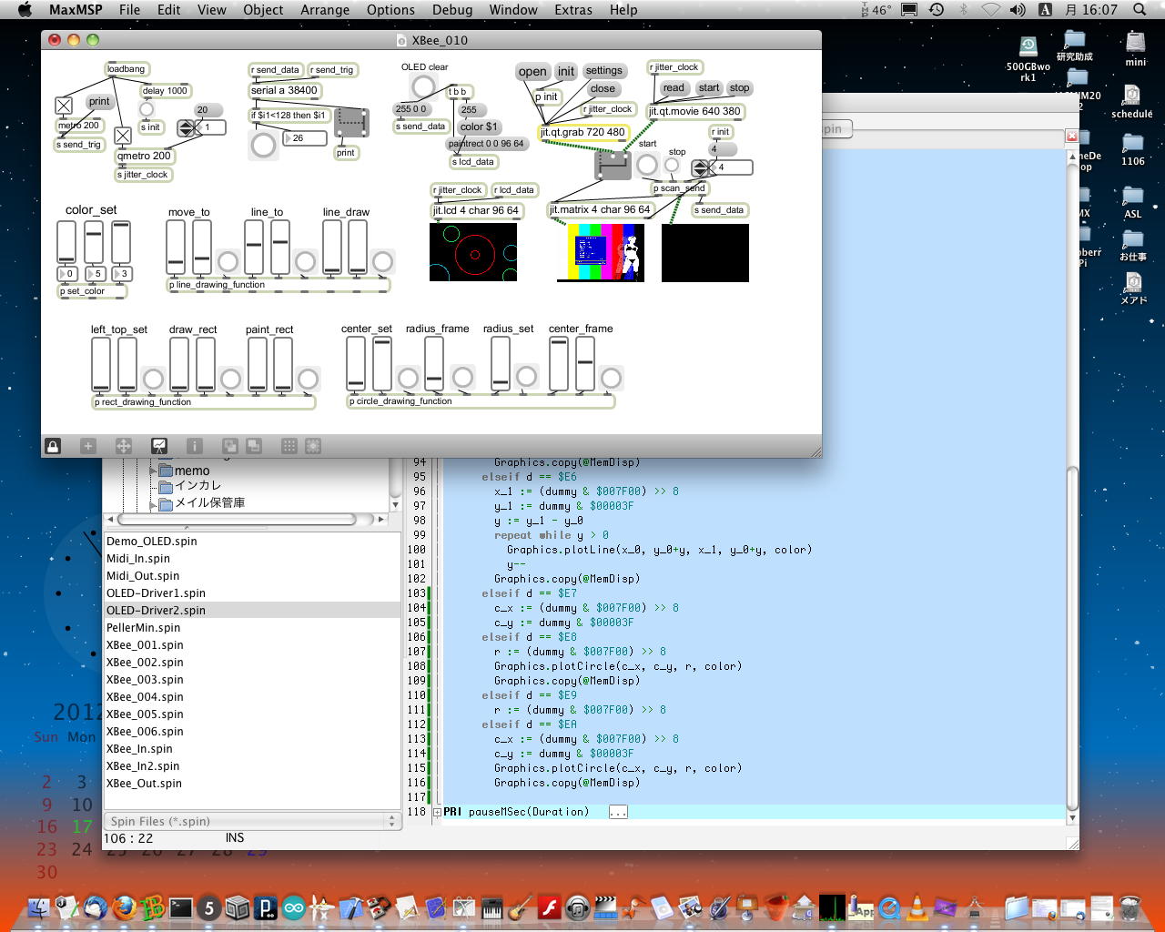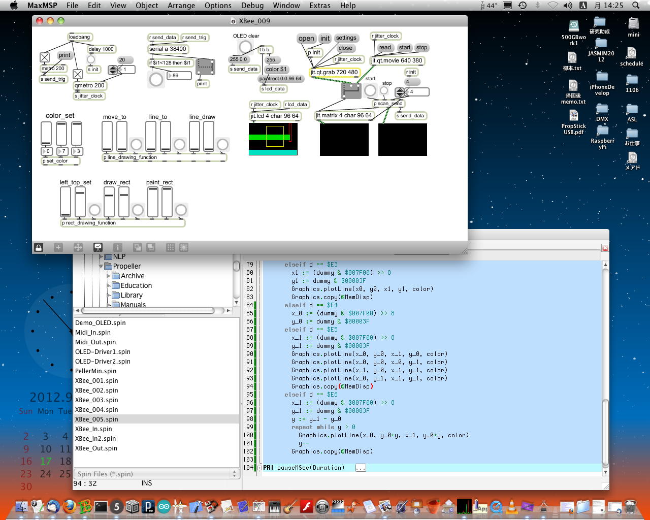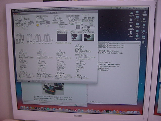 昨日「しばらく先になりそう」と書いたその翌日は、なんと祝日だった(^_^;)。 SUACはお役所なので休日祝日は完全停止、宅急便も郵便も届かず事務作業も出来ない。 そうなれば、研究室であれこれ三昧という事になる。これを「Propeller日和」という(^_^)。 仕掛っていたコマンドプロトコルに関して、寝かせていれば熟成するもので、 ちょっと頭の中で整理できてきたので、途中まで進めてみることにした。 まずは以下のように、2週間ぶりの研究室のお仕事Macにセッティングである。 やはり、2画面あると、まさに「お店を広げる」カンジで、やりやすい(^_^)。 Mac miniなので、カメラはFireWire経由でiSightを繋いでみた。引き続き、窮屈なMacBookAirでやりくりして詰め込んできたパッチを開いて、以下のように、 ライン描画コマンドをMaxの側で繰り返して矩形を描画した実験の部分を、サブパッチとして収めた。 これでスッキリしたので、まだまだ作っていける(^_^)。