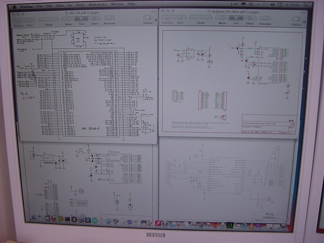 The Arduino Nano is a small, complete, and breadboard-friendly board based on the ATmega328 (Arduino Nano 3.0) or ATmega168 (Arduino Nano 2.x). It has more or less the same functionality of the Arduino Duemilanove, but in a different package. It lacks only a DC power jack, and works with a Mini-B USB cable instead of a standard one. The Nano was designed and is being produced by Gravitech.ということで、CPUが16ビットから32ビットのATmega328になっただけで、図面的には Arduinoマニュアル(V2.3) を適用して、以下を整理してみた。これで残る登場人物はGainerである。 Gainerだけは他の3つのマイコンと違って、スタンドアロンでなく、ホストPC側にMaxとかFlashなどが走ることになる。 そして、I/Oピンが4*4=16ビットしかないので、ファームウェアとして持っているいくつものモードから切り換えて使用する。 この汎用実験基板に搭載するには、そのあたりを他の3種のマイコンとどう摺り合わせるか、 というのが、おそらく設計上の最大の「腕の見せ所」である。 明日は、東京デザイナーズウイークに出展するという3回生4人からのアポだけなので、 Gainerも進めて、基板設計の全体像を目標にしてみよう。