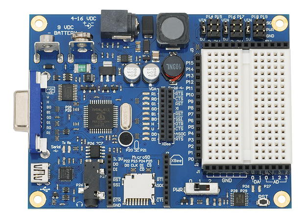 VIN端子に6-20V(7-12V推奨)を供給すると内部+5Vを外部にも出せる。ただしオンボードのFTDIインターフェースICはUSB接続している時にだけUSBバスパワーで動作するので、スタンドアロンでVINとか+5Vを受けた場合には、+3.3V出力は出てこないらしい(本当?)- リセット(負論理でSW経由でGNDショートでOK?)
