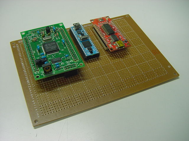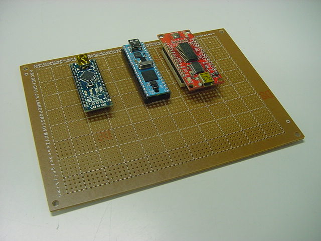 しかし以下のように、今回の実験試作基板のサイズとして想定しているユバーサル基板の上にさらに並べてみると、 ちょっと窮屈である。やっぱりこれを搭載するのは無理かなぁ。 さて、懸案のGainer回りの検討に入ることが出来ないまま夕方になってしまった。 Gainerについては、小林さんの 公式サイト にも、もちろん 解説ページ があり、ここに電気的なスペックとかが載っている。 ただし「パッと見」には、Gainer miniを製造している この会社 の このPDFの表 が便利なので、ここではこちらを使うことにした。 8つのコンフィギュレーションのうち、「7」と「8」は特殊なので除外して、6つのコンフィギュレーションがあるが、いずれにおいても「アナログ出力」というのは、 実はPWMのディジタル出力である。外部D/Aに出すにはピンが少ないので、ここが「汎用」という時のGainerの最大の弱点である。 以下の整理においては、なるべく最大機能で使えるように、それぞれコンフィギュレーションを変更する、と規定している。 どうもここまでは、ネットで見つけた「Gainer mini」を想定しつつも、手元にはオリジナルのGainerしか無かった、 という状況を初めて理解した(^_^;)。 Gainerは28ピンでも2列の間隔がかなり広い(1インチ?)が、上の図からは、Gainer miniはそれより狭いものの、 通常のDIPの600mil(2列の間隔が0.6インチ)よりもやや広い(0.7インチ?)気もする。 現物を注文してみたので、届いたら計測して上の図を補強することにした。 この日記も既に100kBを越えているので、ここを区切りとして、次は「続・Propeller日記(4)」としていこう。