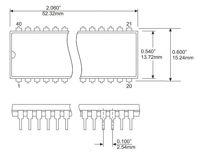 40ピン- 外形寸法、mil幅、ビン配置/定義の図面