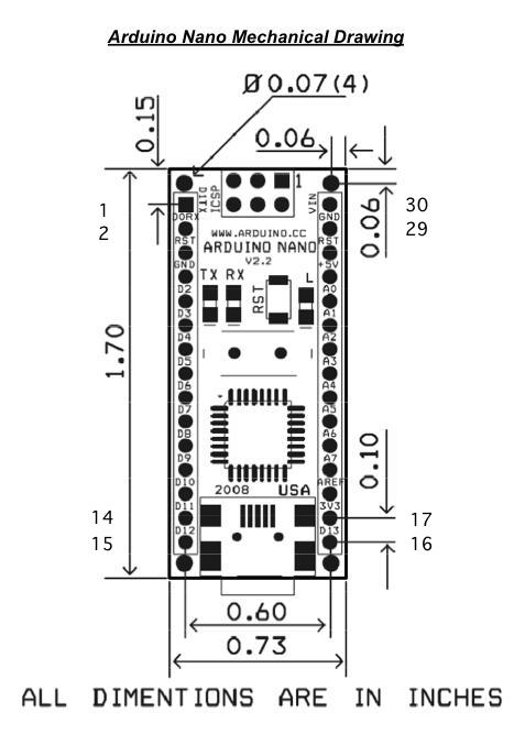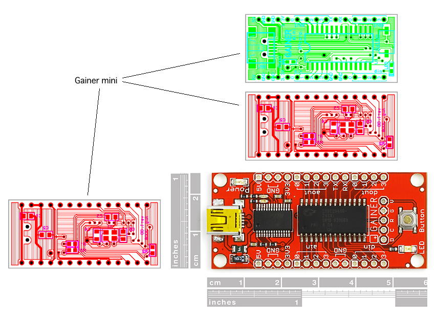 オリジナルのGainerを作っているsparkfunの資料から、以下である。 オリジナルのGainerとは、ビン間が0.1インチで14ピン2列、というのはピン互換だが、基板全体として2列の間隔が異なっているので注意が必要である