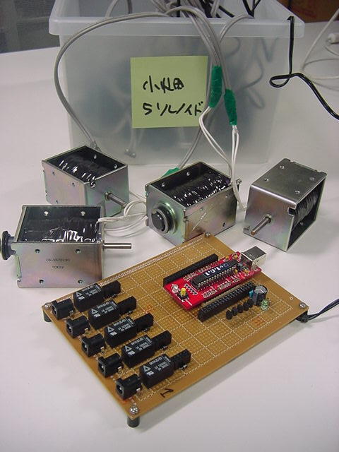 前夜はDVD鑑賞に燃えた。 届いたばかりのMJのDVD「ライヴ.アット.ウェンブリ. 7.16.1988」を観たが、 いやー、良かった(^_^)。 mixiの日記(友人限定)に思わず以下のように紹介した。これは「買い」のDVD AKBとかの学芸会芸能人は流石に恥ずかしくなるでしょう。これ観たら。 マイケル・ジャクソン DVD ライヴ.アット.ウェンブリ. 7.16.1988 凄く良かったです(^_^) This is Itも凄いけど、これは25年前、まさに全盛期のMJが同じ曲をやってます。 キレてます。お奨めです。 ホーナストラックの横浜アリーナでのMJコンサートの客席の日本人が、 いやー「昭和」でしたが。(^_^;)・・・しかし、MJと僕は同い年なのであった。山口百恵も同級生なのであった。(^_^;) 午前中には、アポのあったメディア造形の田中さん他3人(空間1人・生産2人)が研究室に来たが、 あと1ヶ月ほどで出展するというインスタレーション作品の制作に対するプロジェクトマネジメントの甘さが凄かった。 センサ等をサッサと仕込めば、純然たる造形作品よりも簡単に作品が作れる、 と思うその誤解は、こちら教員にも原因があるのかもしれない。 マルチメディア室に行って、かつて ここ にある小畑さんの作品「海潮音」のために製作した、以下の5チャンネル・ソレノイド駆動システム(Gainer)を貸し出す、 という事になったが、これからの制作が順調に進まないと、構想した作品を実現するのはなかなか大変である。