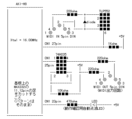 ここにあるように、ボード上のRS232CインターフェースICの11/12番ピンをカットする。あとはここにあるように、この回路でOK(動作確認用LEDのCN1-23pinはナシ)- MIDI出力増設法