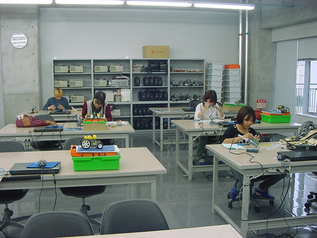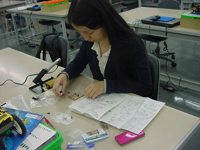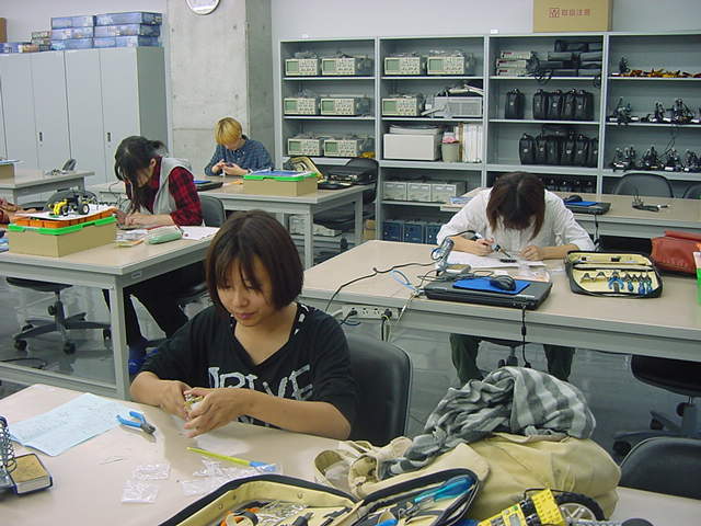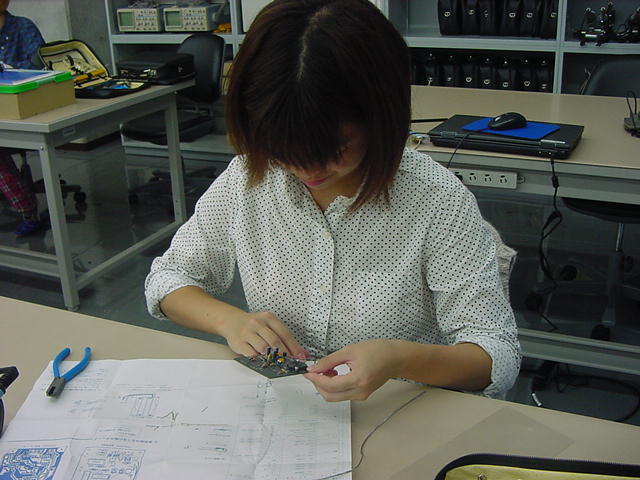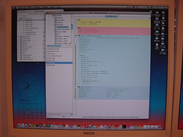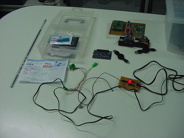 そして、シリアル受信プログラムは以下である。CON _clkmode = xtal1 + pll16x _xinfreq = 5_000_000 OBJ serialOut : "XBee_Out2" serialIn : "XBee_In3" PUB main | dummy, num, d serialOut.start(21) serialIn.start(20) port_initial repeat dummy := serialIn.event if dummy <> -1 d := (dummy & $FF0000) >> 16 if d == 144 d := (dummy & $000100) >> 8 if d == 1 outa[22] := 1 else outa[22] := 0 elseif d == 145 repeat num from 0 to 3 outa[19..16] := !( 1 << num ) d := ina[15..8] outa[19..16] := %1111 dummy := $900000 dummy := dummy + (num*2) << 16 dummy := dummy + (num*2) << 8 dummy := dummy + d & %00001111 serialOut.fifoset(dummy) dummy := $900000 dummy := dummy + (num*2 + 1) << 16 dummy := dummy + (num*2 + 1) << 8 dummy := dummy + (d & %11110000) >>4 serialOut.fifoset(dummy) PUB port_initial dira[19..16]~~ ' output dira[22]~~ ' output outa[19..16] := %1111 dira[15..8]~ ' inputそして、シリアル送信プログラムは以下である。VAR long rx_Head, rx_Tail, rx_Buff[64] PUB start(_midiPin) : status midiPin := _midiPin rx_top := @rx_Head rx_end := @rx_Tail rx_fifo := @rx_Buff bitticks := clkfreq / 19_200 halfticks := bitticks / 2 longfill(@rx_Head,66,0) status := cognew(@asm_entry, 0) PUB event : status status := -1 if rx_Tail <> rx_Head status := rx_Buff[rx_Tail] rx_Tail := (rx_Tail + 1) & $3F DAT org asm_entry mov midiMask,#1 shl midiMask,midiPin getMidiByte waitpne midiMask,midiMask mov bitClk,cnt add bitClk,halfticks add bitClk,bitticks mov testBits,#9 :check_loop waitcnt bitClk,bitticks test midiMask,ina wc rcr rx_data,#1 djnz testBits,#:check_loop shr rx_data,#32-9 and rx_data,#$FF test rx_data,#%10000000 wz if_z jmp #:running mov rsb,rx_data mov dcb,#0 jmp #getMidiByte :running tjnz dcb,#:byte_3 add dcb,#1 mov keyno,rx_data jmp #getMidiByte :byte_3 mov dcb,#0 mov event_data,rsb shl event_data,#16 mov t1,keyno shl t1,#8 or event_data,t1 or event_data,rx_data :write_event rdlong t1,rx_top mov rx_pointer,t1 shl rx_pointer,#2 add rx_pointer,rx_fifo wrlong event_data,rx_pointer add t1,#1 and t1,#$3F wrlong t1,rx_top jmp #getMidiByte t1 long 0 midiMask long 0 testBits long 0 bitClk long 0 bitticks long 0 halfticks long 0 midiPin long 0 rx_top long 0 rx_end long 0 rx_fifo long 0 rx_data long 0 rx_pointer long 0 event_data long 0 rsb long 0 dcb long 0 keyno long 0 fitここまで出来たところで、「サウンドデザイン演習」で電子工作キットを製作中の学生からヘルプがあって、 ちょっと電子制御機器制作室に出かけた。以下がその様子である。VAR long tx_Head, tx_Tail, tx_Buff[64] PUB start(_midiPin) : status midiPin := _midiPin tx_top := @tx_Head tx_end := @tx_Tail tx_fifo := @tx_Buff bitticks := clkfreq / 19_200 longfill(@tx_Head,66,0) status := cognew(@asm_entry, 0) PUB fifoset(_tx_data) tx_Buff[tx_Head] := _tx_data tx_Head := (tx_Head + 1) & $3F DAT org asm_entry mov midiMask,#1 shl midiMask,midiPin or dira,midiMask :fifo_check rdlong t1,tx_end rdlong t2,tx_top cmp t1,t2 wz if_z jmp #:fifo_check mov t2,t1 shl t1,#2 add t1,tx_fifo rdlong event_data,t1 mov t1,t2 add t1,#1 and t1,#$3F wrlong t1,tx_end mov tx_data,event_data shr tx_data,#16 mov status_d,tx_data call #send_event and status_d,#%11100000 cmp status_d,#%11000000 wz if_z jmp #:byte_2 mov tx_data,event_data shr tx_data,#8 call #send_event :byte_2 mov tx_data,event_data call #send_event jmp #:fifo_check send_event and tx_data,#$FF or tx_data,#$100 shl tx_data,#1 mov testBits,#10 mov bitClk,cnt add bitClk,bitticks :bit_send shr tx_data,#1 wc muxc outa,midiMask waitcnt bitClk,bitticks djnz testBits,#:bit_send send_event_ret ret t1 long 0 t2 long 0 midiMask long 0 testBits long 0 bitClk long 0 bitticks long 0 midiPin long 0 tx_top long 0 tx_end long 0 tx_fifo long 0 tx_data long 0 status_d long 0 event_data long 0 fitそこそこ進展したので、今日はここまで。 伊熊システムを移管できれば、いよいよ汎用試作基板に戻ることになる。 フト思い立って、来年3月の情報処理学会全国大会(東北大)にエントリーしたので、 このネタを進めていかなくては。 2012年10月23日(火)