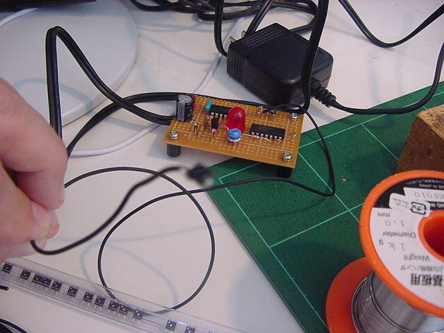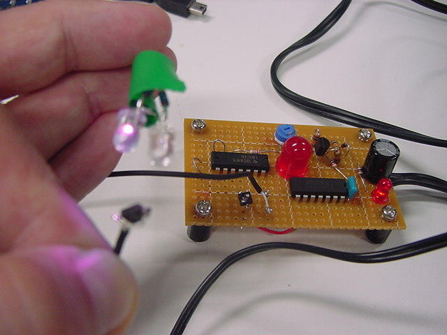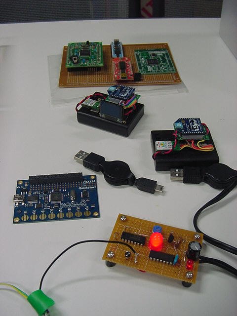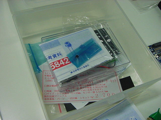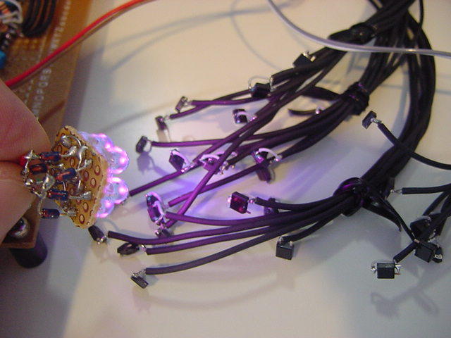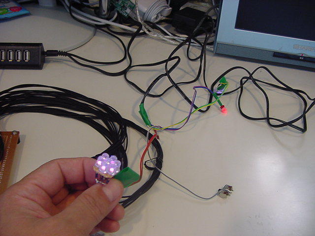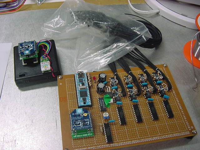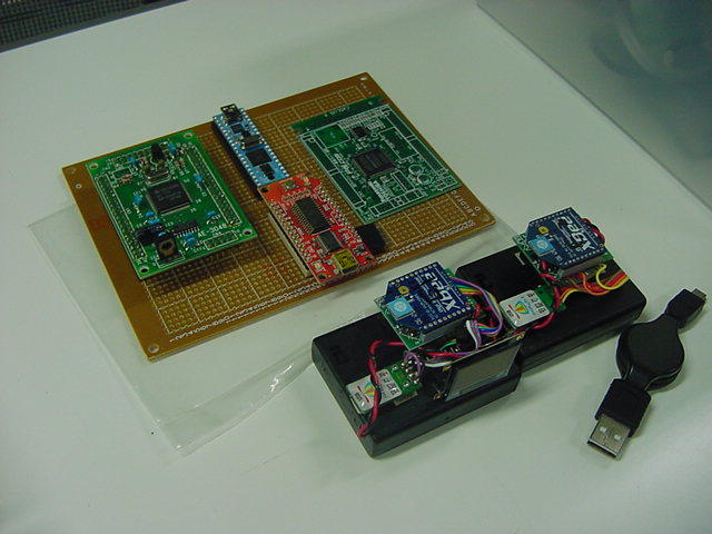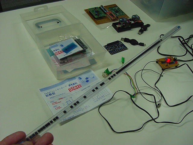 これはM2の伊熊さんの修了制作のインスタレーション作品に使われる、 UVセンサの部分である。 まだ未発表の新作なのでここで詳細は書かないが、多数のUVセンサからの情報を、 ワイヤレスでホスト(Max)に送る必要がある。 XBeeもそのために実験したのだが、ここで、当初はAKI-H8で行うつもりだった処理を、 届いたばかりのPropQuickStartを使う、というアイデアを思いついた。 ちょうどPropeller日記を書いていることもあるので、ここではやはり、Propellerで行ってみよう。