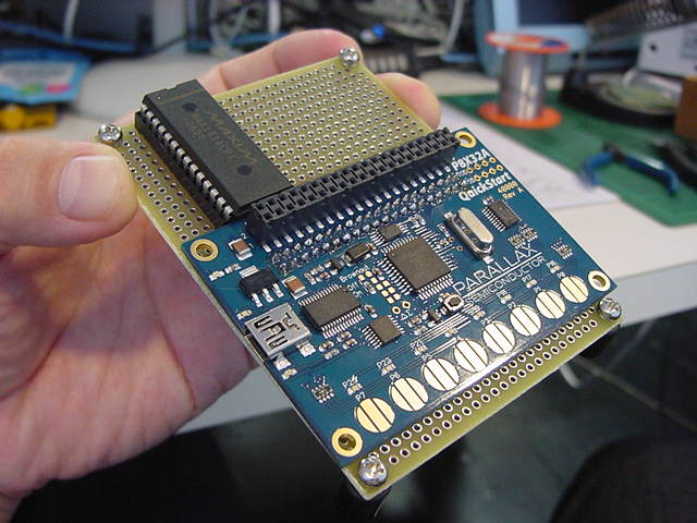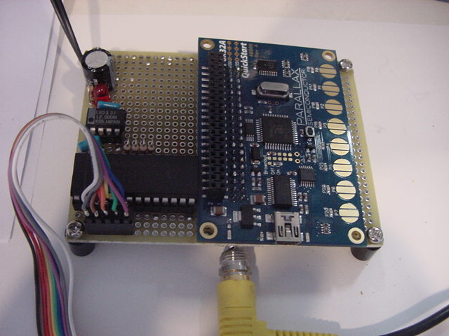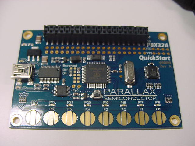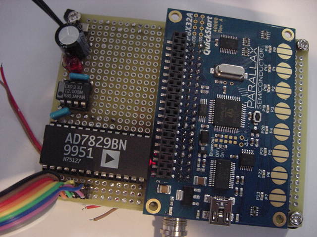 → これではなんのための汎用試作基板か分らなくなる(^_^;)上のように進めてきた回路設計だが、いざPropellerとMAX161との接続を詳しく調べていくうちに、 ちょっと雲行きが怪しくなってきた。 MAX161 は、互換性はないものの、昔から定番の ADC0808 の機能については単純に置き換えられる・・・と思っていたのだが、 どうもマニュアルPDFを読むと、MAX161の方が後発で高機能にしているため、 単純にADC0808のように使えるのかが不安になったきた。 MAX161では、Vrefにいろいろマイナス電圧を与えて、+10Vとか-10Vとかのユニポーラ、 さらに±5Vでのバイポーラなども設定できるのだという。 こちらは単純にADC0808と同様の、「+5Vユニポーラ」として使えればいいのだが、 マニュアルにその回路が無くて、たぶんVref=+5Vでいいと思うのだが、なんか不安がある。 ADC0808は単純でいいのだが、マニュアルPDFを読むと、ディジタルのインターフェースがHSCMOSではなくてTTLのため、 Propellerの+3.3Vの信号出力では「Vcc-1.2V」というHレベルのスレショルドに不足する。 ここにわざわざ、レベル変換の石を使うのもシャクである。 仕方ないので、この部分は、Propeller(+3.3V系)とのインターフェースの確認を兼ねて、 回り道して、せっかく9月25日に届いたのにまだ遊んでいなかった、以下のPropQuickStartボードで実験してみることにした。
