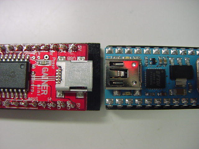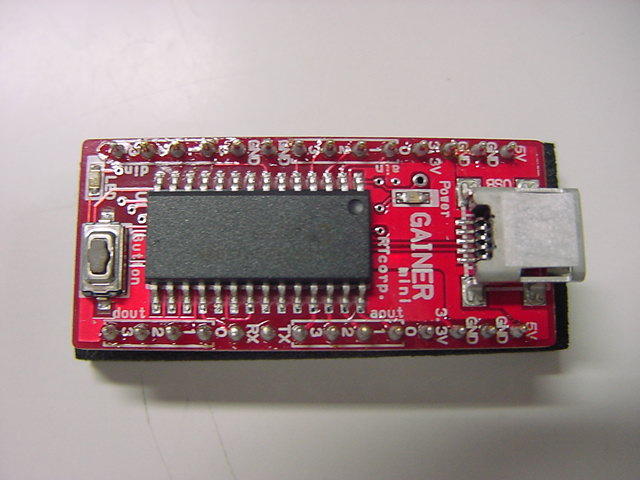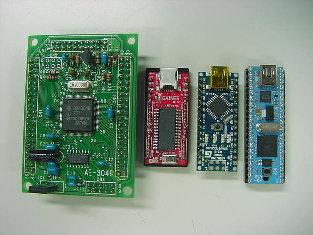 ・・・というところで、9月25日(火)に情報を整理して、外形寸法が不明だった、 Gainer miniがやって来た。 以下のように、これまでの通常のGainerよりも、かなり小さい。 他のマイコンと並べてみると、28ピンでその幅は600milになっていて、 通常の28ピンのRAM等と同じであった。 これで搭載されるマイコンも全て揃った。 汎用実験試作基板の設計は、UVセンサの後となるが、こちらも進めていきたい。