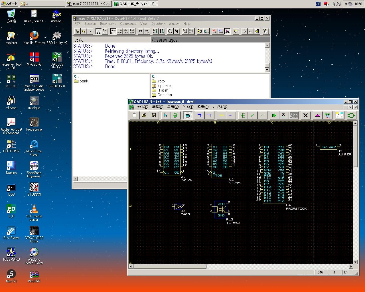 いよいよ後期、新学期スタートである。 昨日はOGの野口さんと「浜松餃子まつり」に10時半から行き、6種類の餃子とビール2杯を堪能、 ぎりぎり台風の雨が降り出すお昼前に自宅に送ってもらって、あとは台風情報とともに夏休み最後の休日をだらだら過ごした。 そして今日は、台風一過の好天である。後期の講義は、大学院「メディアデザイン特論」と芸術文化学科専門科目「メディアアーツ論(現代芸術論C)」とメディア造形学科専門科目「サウンドデザイン演習」とを、 全て水曜日にかためているので、月・火・木はかなり余裕がある。 伊熊さんのセンサが製作途中であるが、実験基板試作はリードタイムがあるので、忘れないためにも、 今日はP板試作のための回路設計作業から始めることにした。 久しぶりに「CADLUS Circuit」を起動してみると、以前に作ったPropStickが部品として表示されていなかったり(^_^;)、 お仕事Macに転送するためにFTPしてみると蹴られたり(^_^;)、と苦闘しながら、 なんとか以下のように、PropStickを部品として含めた図面が復活し、またFTPも繋がった。 これだから、時間をあけるとイケナイのである。