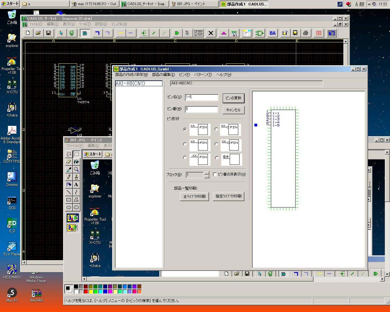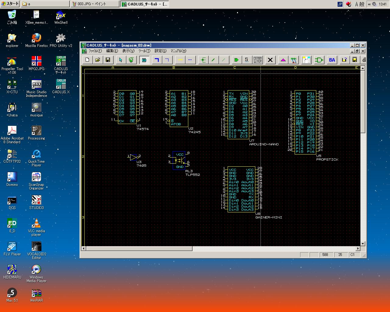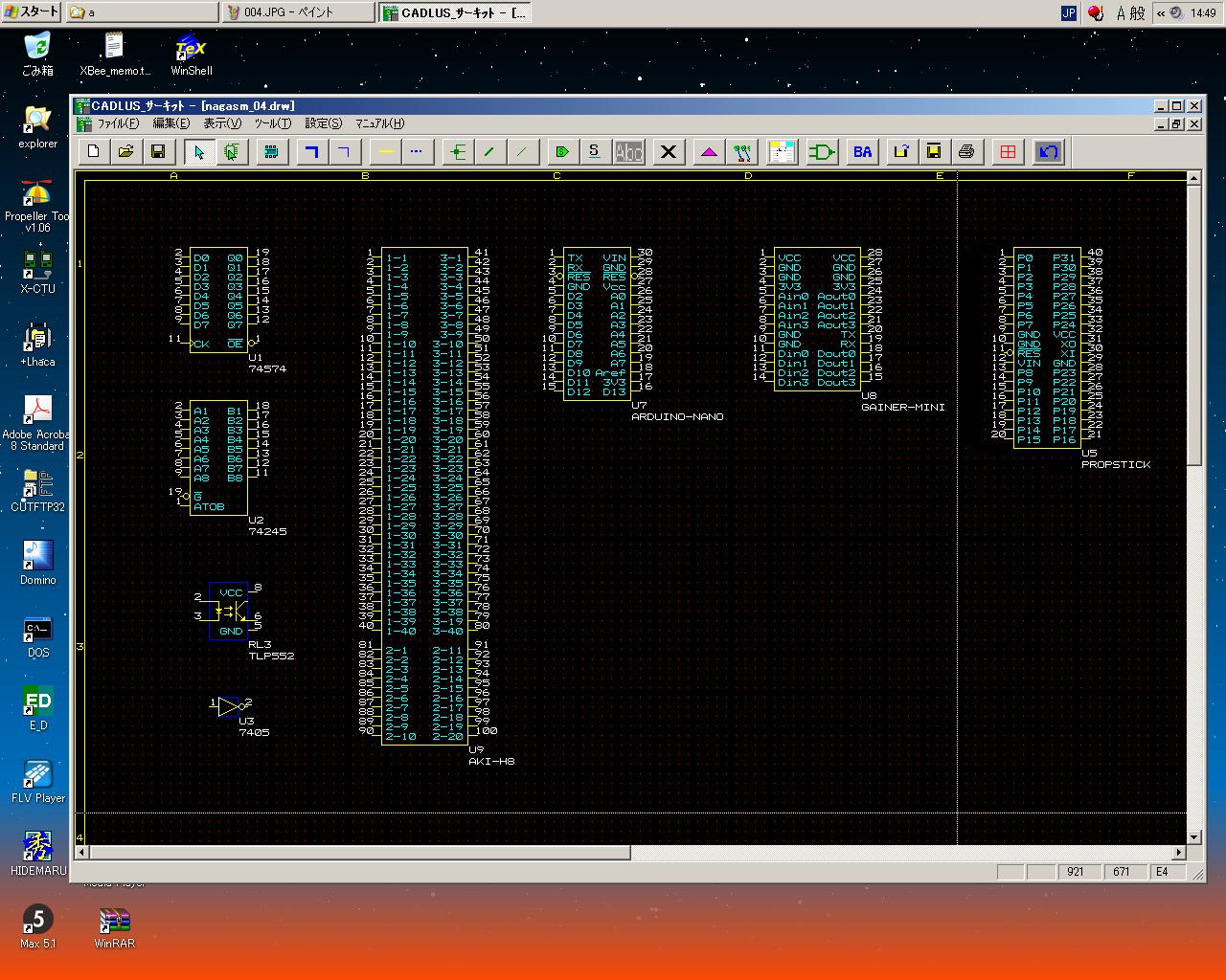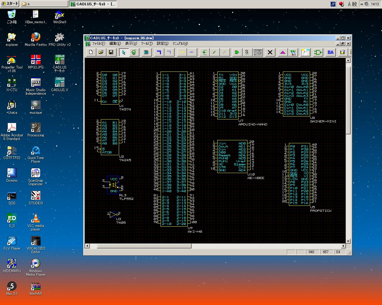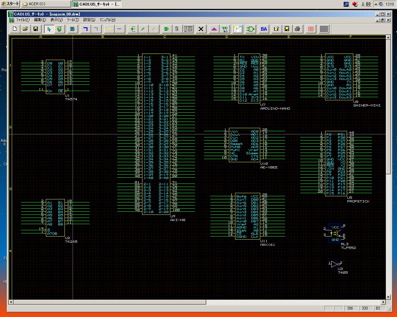 そして、ここまで入力したところで、フト不安になった。 こうやって入力したところで、AKI-H8の3つに分割したコネクタを後で部品配置として統合できればいいが、 実はAKI-H8全体として登録しないと駄目、となれば、この単調作業は無駄骨となる。 そこで作戦を変えて、このAKI-H8については「P板.com」に以下のように質問のメイルを出して (さりげなく最後に虫のいい項目を加えてみたが、果たしてどうなるか)、 DIPサイズのArduino Nanoを入力する、と変更した。 そしてしばらく、Arduino Nanoの新規部品登録をして、以下のようになったところで悲劇は起きた(^_^;)。 突然にエラーメッセージが出て「CADLUS Circuit」がクラッシュして、ライブラリから、 以前に登録していた「ジャンパ」と「PropStick」が消滅していた(;_;)。 またやり直しかぁ。 こうなると、部品を作ったたびに、上書きでなく新しいライブラリ名として登録していくことになる。 だからCADは嫌いなのだ。(^_^;)P板.comサポート窓口 御中 お世話になります、登録会員の長嶋と申します。 貴社に基板を発注すべく、「CADLUS Circuit」で回路入力を始めています。 質問がありますので回答をお願いします。 今回の基板には多数のマイコンを搭載するのですが、その中で、 DIP形状でないものについての質問です。モノは秋月電子の「AKI-H8」です。 http://nagasm.org/ASL/Propeller2/20120924/002.jpg という基板で、このうち3つのコネクタ http://nagasm.org/ASL/Propeller2/20120924/001.jpg を基板に取り付けます。 回路図は以下です。 http://nagasm.org/ASL/Propeller2/20120920/AKI-H8.pdf 質問(1) この場合、「CADLUS Circuit」で新しい部品として登録するのに、AKI-H8の 3つのコネクタを別々の部品として登録して、それらの配置情報として http://nagasm.org/ASL/Propeller2/20120924/001.jpg のように指定するのか、それとも、AKI-H8という部品としては3つのコネクタに 分かれる全てのピン(計100ピン)を持つ、1個の部品として登録するのか、 という事です。 質問(2) AKI-H8のコネクタは http://nagasm.org/ASL/Propeller2/20120924/001.jpg のように、20ピン2列ですが、ピン番号は通常のDIPとかと違う並びになっています。 (1列目と2列目とで行ったりきたり) これは外形図のときにきちんとこの図のように示せば、部品登録においては、単に http://nagasm.org/ASL/Propeller2/20121001/002.jpg のように並べていいのでしょうか。 質問(3) もし、貴社の既存ライブラリに「AKI-H8」があるのであれば、それが欲しいの ですが・・・(^_^;) 以上、よろしくお願いいたします。消えてしまったものは仕方ないので、とりあえず「Arduino Nano」という部品をコピーして、新たに「PropStick」と名付けて、 もう一度、信号名などを入力した。 上書きはもうこりごりなので(^_^;)、新しいライブラリとして、これをさらに新しい図面として登録した。 このあたりの融通の無さというのは、まぁCADではいつもの事である。 そして以下のように、Gainer miniも登録した。どんどんライブラリも図面も名前を更新して新規登録して、 「上書き保存」をしない、という方針を徹底することにした。 一度でもクラッシュするようなソフトは、もう金輪際、信じないというのが鉄則である。 AKI-H8のコネクタについての質問メイルへの回答にはたぶん1日とか2日の時間を見込んで、 ここで図面の「線引き」にトライすることにした。