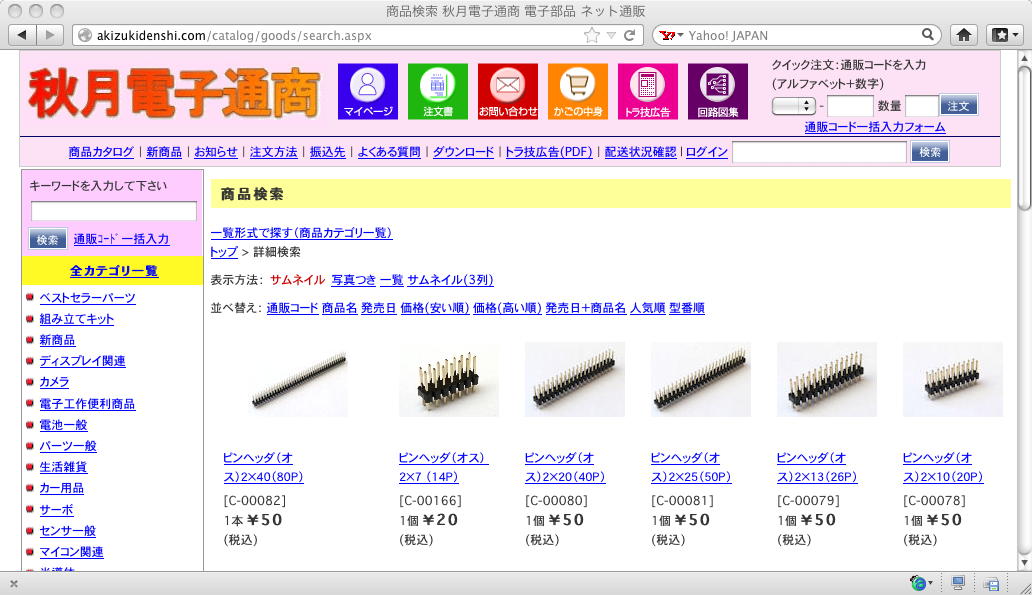 この変換基板のいいところは、電源レギュレータが載っているところで、 XBeeの+3.3V電源を、外部の「Vin」(+4V〜+20V)から作ってくれる。 ただし、Propellerで実験した時にはそのまま直結で良かったが、 +5V系との接続にはレベルシフトを考慮する必要がある。 こちらも秋月電子には外形寸法図は無いので、PDFを拡大して以下のようなものを作った。 あと定義するのは、基板の外部に信号を引き出すためのコネクタである。 全て基本的には、0.1インチピッチの秋月の2列ピンヘッダ/ソケットを使うつもりであるが、ピン数とかはかなりアバウトである(^_^;)。 秋月電子の、ロープロとシングルを除いた「ピンソケット」を検索すると、以下のように5/7/8/10/13/20/22/25/30ピンの7種類がある、 と確認できた。 オスのピンヘッダは以下のように2×7から2×40まで6種類あるが、こちらは好きにカット出来るので、 同じ値段なら「2×40(80P)」をたくさん買って、適当にカットすればいい。 あと注意点としては、これまでに製作した基板でもそうだが、現場の接続で間違わないために、 なるべく異なるコネクタをたくさん使いたいので、これはちょっとしたパズルである。 信号線のコネクタには、余裕ピンを持って、電源やGNDをたくさんアサインしたいところであるが、 「P板.com」の見積りページの経験から、基板の「総ピン数」がコストに大きく影響するので、あまり無駄にたくさん使う、というのも考えものである。 とりあえず全体像を検討するために、フリーハンドで全体を構想しつつ考え始めた。 Propellerでも2ピンを使った逐次比較A/Dコンバータはサンプルがあったが、 ここはAKI-H8とArduinoとGainerが8チャンネルの電圧入力に対応しているので、 汎用の8チャンネルA/Dコンバータを使うことにした。 業界で定番なのは、アナログデバイセズ社の ADC0808 と、ほぼ同等のMAXIM社の MAX161 である。いずれもパッケージは28ピンDIP(600mil)である。 ADC0808は過去に使ったことがあったが、そうなると初めてのMAX161の方を使ってみたいので(^_^;)、 変換スピードが5倍ほど早いが値段も4倍ほどするMAX161を使うことにして、サンプルも手配した。 MAX161まで登録したのが以下の回路図(まだ部品を並べただけ(^_^;))である。