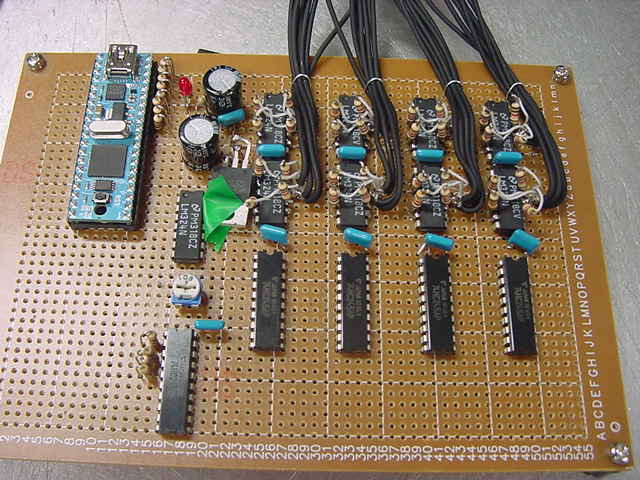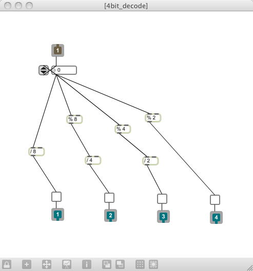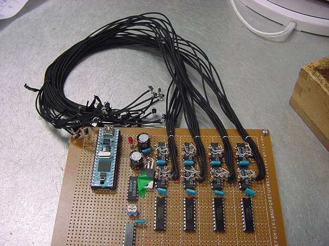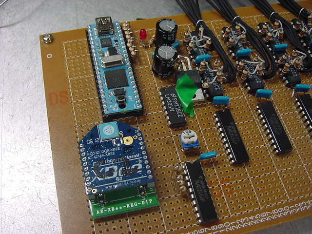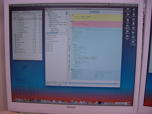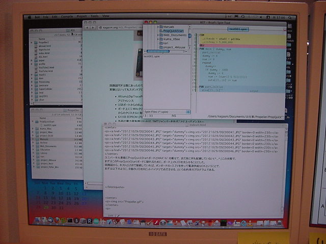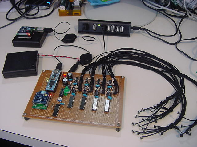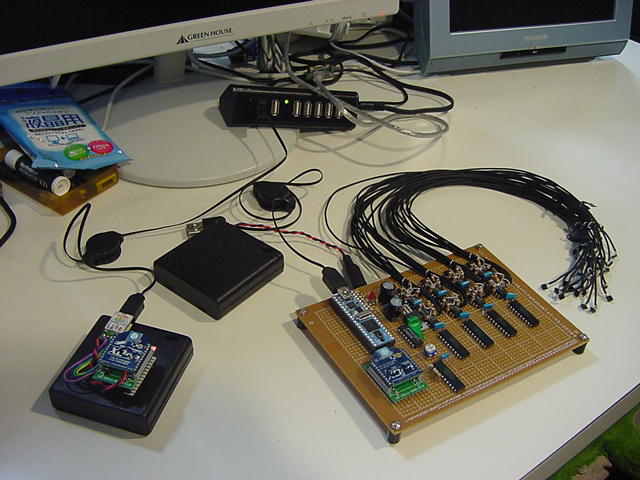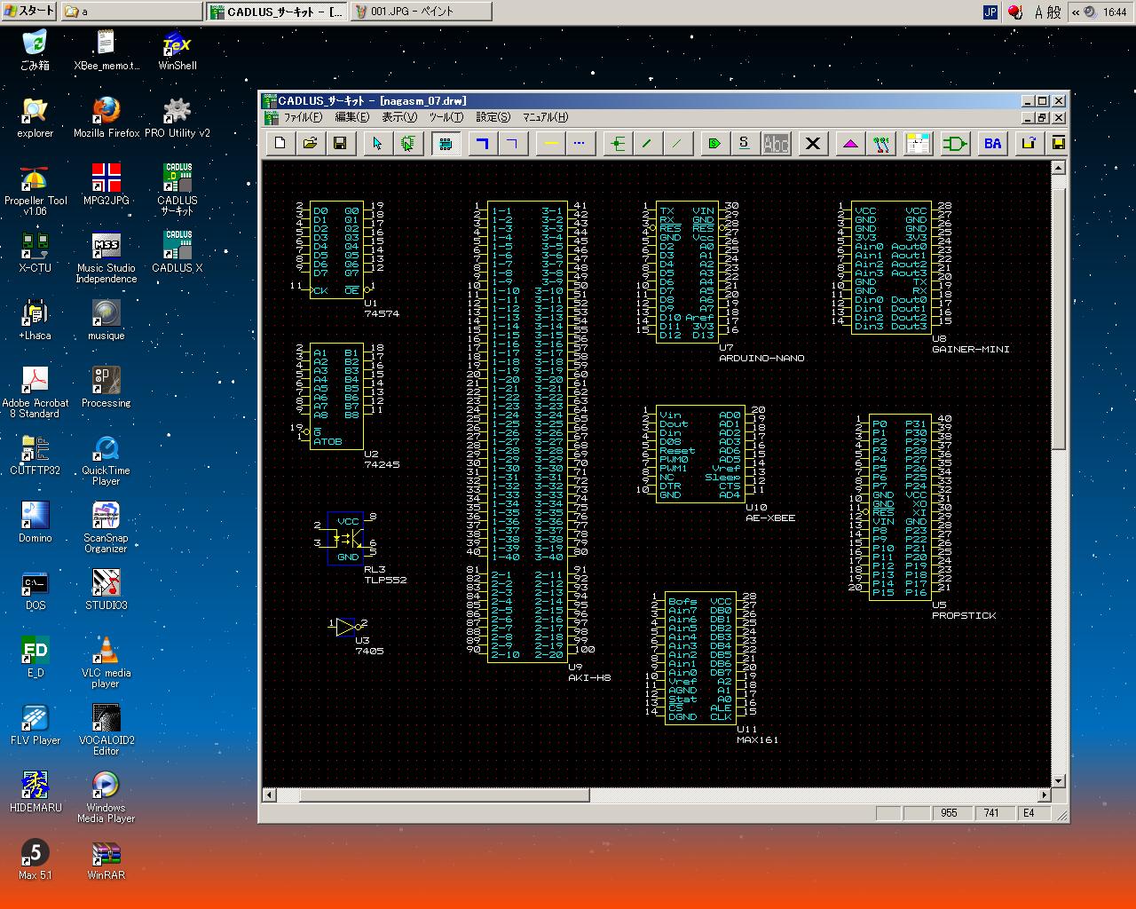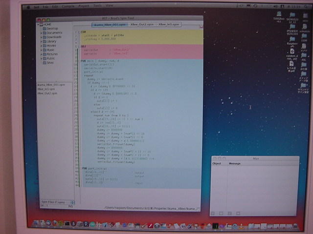 前回の日記から10日近く経過した。 後期にスタートした講義は、3科目とも順調に、軽快に、かなり入れ込んでスタートした。 金重さんと 光で回るドラえもん も作った。 それ以外に進展が無かったわけではなくて、M2の伊熊さんのインスタのためのセンサシステムを、 以下のように少しずつ製作していたが、日々刻々とこの日記を書く余裕が無かっただけである。そして今日は木曜日、午後の学生委員会しかないタイミングに、以下のように無事にセンサシステムは完成した。 あとは明日に、伊熊さんが来たところで、UVセンサとXBee経由で受け取ったMaxパッチのビット対応を調べればいい。 1ビットだけ、UVセンサの出力が出っぱなしになっているが(^_^;)、これは消去法で「どれ」と確定すれば、たぶん簡単に直るだろう。 ここで、自分の備忘録として、このセンサシステム(Propeller活用)について、まとめておこう。 まず、いつものように簡単な回路図だが、以下が全回路図である。(^_^;) これと、以下のPropStickの回路図があれば、あとはMaxのパッチとPropellerのコードで全情報は完結している。 Maxの実験パッチは以下である。 回路としては、まず32個のUVセンサ(光ダイオード)の発生する電圧をOPアンプ(LM324)に入れる。 OPアンプはコンパレータとして動作させ、比較電圧は、共通の半固定ボリュームで設定した電圧をボルテージフォロワで分配している。 この計32個のコンパレータ出力はそのまま 74HC245に入り、4個の74HC245の出力は8ビットのバスに直結する。 245のG入力で常にどれか1個しか出力しないようにPropellerで制御する必要がある。 この出力は+5Vなので、1kΩを直列に接続してPropellerのポートに8ビット並列として入力する。 Propellerの別の4ビット出力は、74HC245にそのまま入力すると、スレショルドの関係でそのまま+5V系になる。 この4ビットを、4個のセンサ入力の74HC245のGに入れている。デコードはソフトである。 Propellerのピンは+3.3V系なので、XBeeとはそのまま直結できる。 これが上の回路図の全てである。