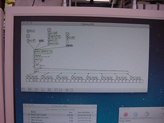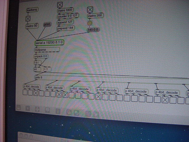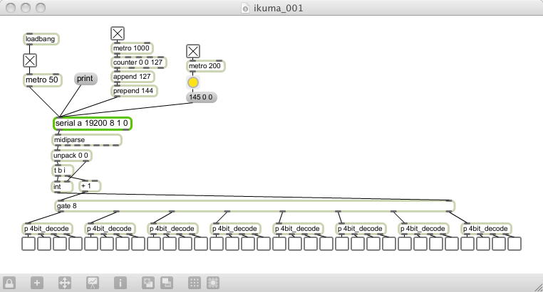 Maxパッチについても、何も目新しいことはない。 19200のスピードでシリアルポートをopenして、50msecのmetroで叩く。 1000msecごとに出しているのは、動作確認用に追加したPropellerのLEDを点滅させる命令として使っている。 そして、200msecごとのmetroの情報をトリガとして、Propeller側では32ビットのUVセンサの情報を一気に取得して、 MIDIノートオンイベントの8チャンネル分に4ビットずつ分割して返送する。 イベント発生チェックの管理も、受信するMaxの側にしている。