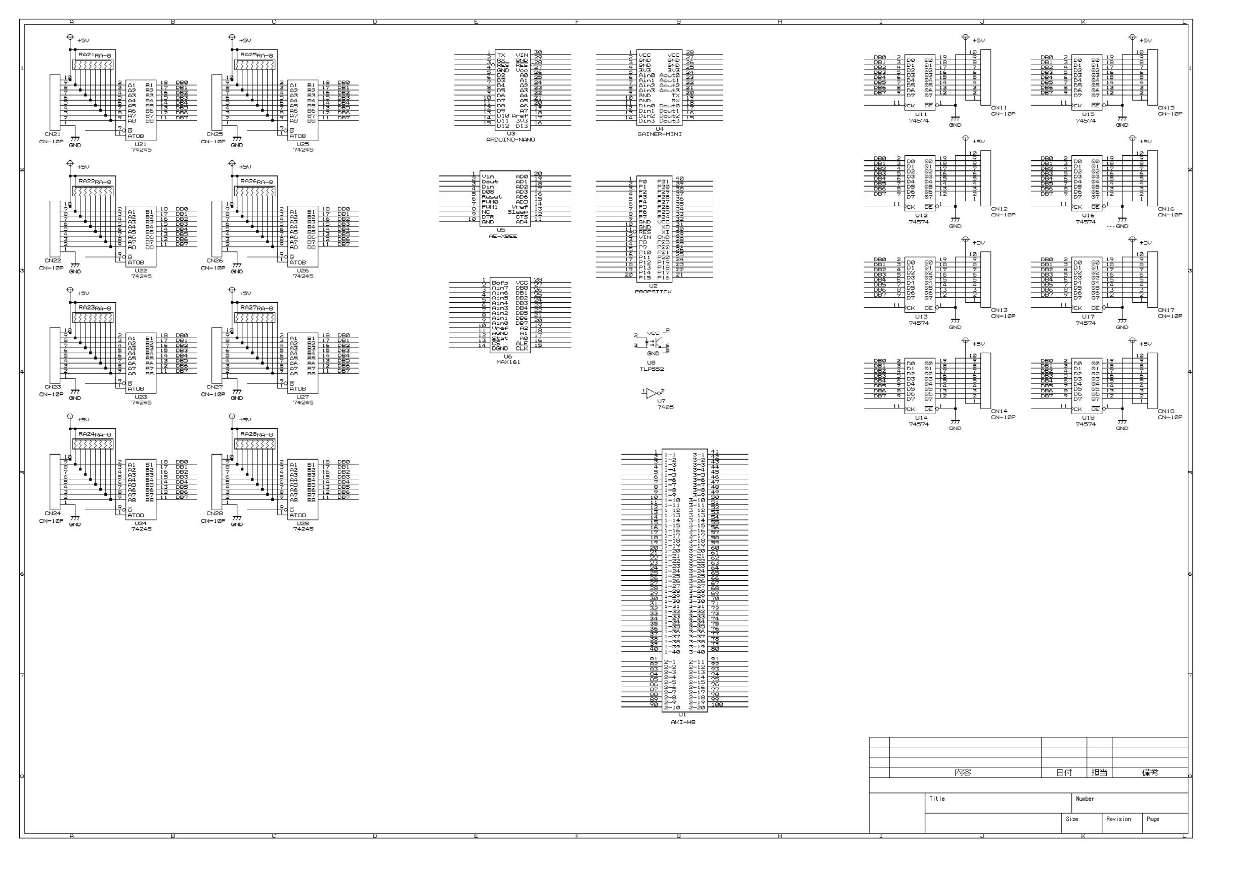 ここに、まずは入出力を8ビットのデータバスとして8ポートずつに拡張するために、 8個の74HC574と10ピンコネクタ、8個の74HC245と集合抵抗と10ピンコネクタを並べてみて、 A4で入らなくなったのでサイズをA3にしたのが これ であり、JPGにしてみると以下のようになった。 この紙面サイズで入らなくなれば、次はA2である(^_^;)。 なんとも面白くない作業であるが、これを進めないと完成しない。 なかなか辛い道のりである。 2012年10月27日(土)