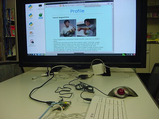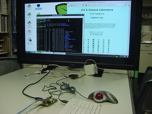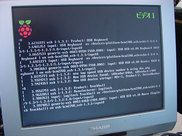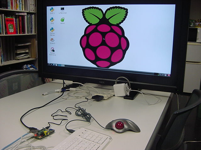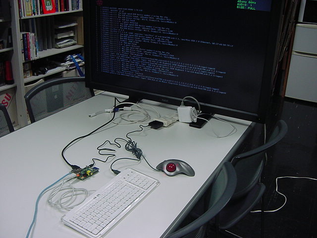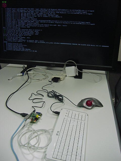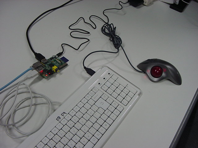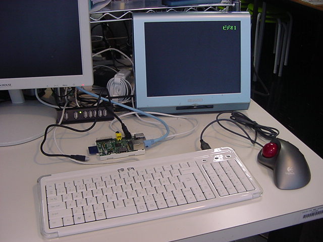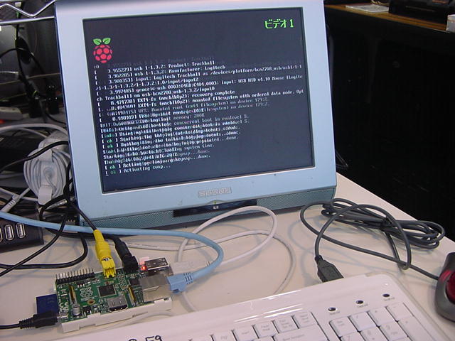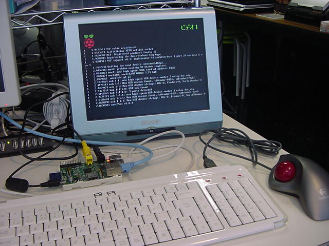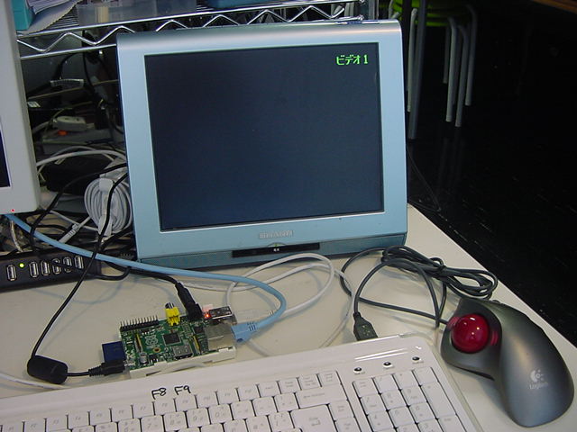 USBキーボードとマウス(トラックボール)は、まさにCADをやっているWindowsXPマシンから引き抜いて挿した。 付属してきた「Prepared SD card」はノーブランドでなくTranscendの4GBだった(^_^)ので安心してスロットに挿入した。 「HDMI or DVIモニター」は研究室に無いことが判明(^_^;)したので、当面は机上の11インチのテレビのビデオ入力に接続した。 たぶんUnixの画面はとても読めないので、ちゃんとやるには買わないといけない。 「Micro USB power supply」については、パソコンやHUBに繋いでは駄目、最低700mA が必要、とあった。ちょうど研究室には、SonyのPCMレコーダ用かなんかの専用USBアダプタ(5V800mA)があったのでこれを使った。 「Ethernet LAN cable (optional)」も、せっかくなので繋いでみた。 学外には出れなくても、DHCPであれば研究室内で他パソコンと通信できるだろう。 ![]()
