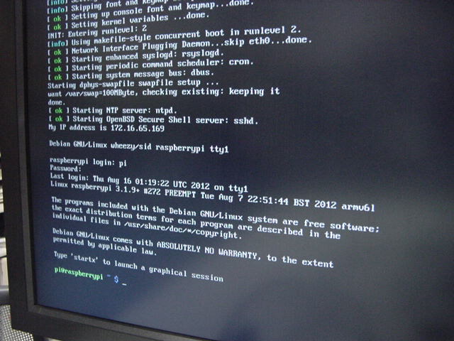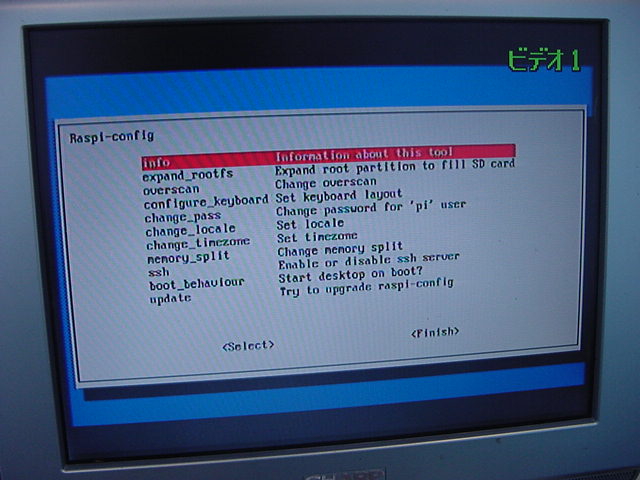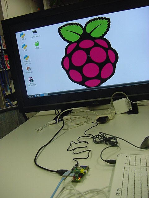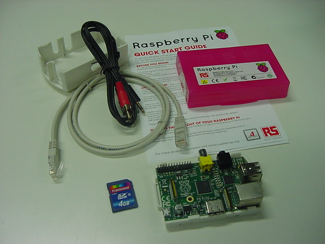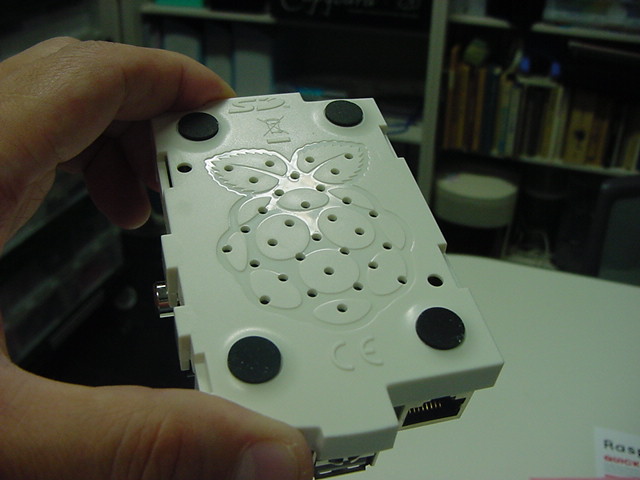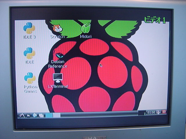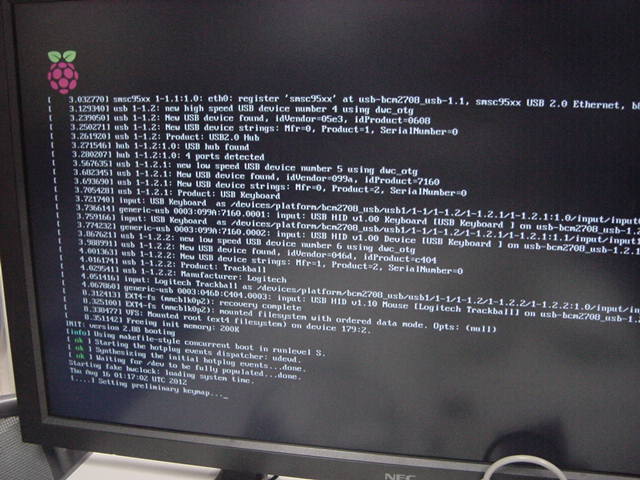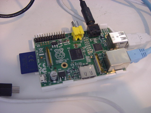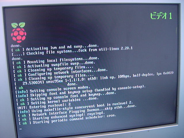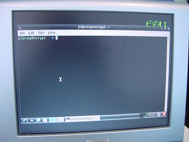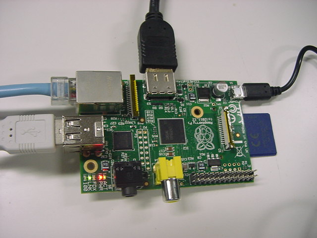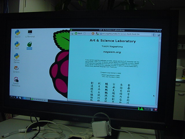 USBキーボードとマウス(トラックボール)は、まさにCADをやっているWindowsXPマシンから引き抜いて挿した。 付属してきた「Prepared SD card」はノーブランドでなくTranscendの4GBだった(^_^)ので安心してスロットに挿入した。 「HDMI or DVIモニター」は研究室に無いことが判明(^_^;)したので、当面は机上の11インチのテレビのビデオ入力に接続した。 たぶんUnixの画面はとても読めないので、ちゃんとやるには買わないといけない。 「Micro USB power supply」については、パソコンやHUBに繋いでは駄目、最低700mA が必要、とあった。ちょうど研究室には、SonyのPCMレコーダ用かなんかの専用USBアダプタ(5V800mA)があったのでこれを使った。 「Ethernet LAN cable (optional)」も、せっかくなので繋いでみた。 学外には出れなくても、DHCPであれば研究室内で他パソコンと通信できるだろう。 ![]()