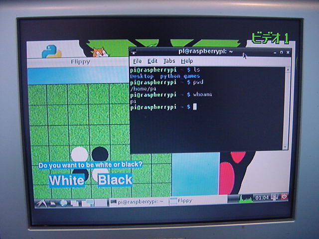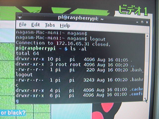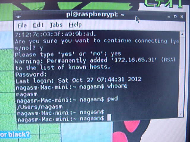 ここでいざUSB電源プラグを差し込もうとすると、なんとジャックの一部に突起があって差し込めなかったが(^_^;)、 そこをラジオペンチで押しつぶして、無理に立ち上げてみた。 何度かビデオ出力が荒れてリセット(リセットボタンが無いのでいちいちUSB電源アダプタを抜いて挿す(^_^;))したが、 以下のように無事にLinuxが起動し、さらにX-Windowシステムが起動して、ターミナルとかゲームとかがちゃんと動いた。 ホストのお仕事Macのリモートユーザ接続を許可してみると、ちゃんとsshでログイン出来た。 これが約2000円のボード単体で、初めて電源を入れてから15分ほどで全て動くのである。 やはり、世界中から注目されるのも当然だろう。