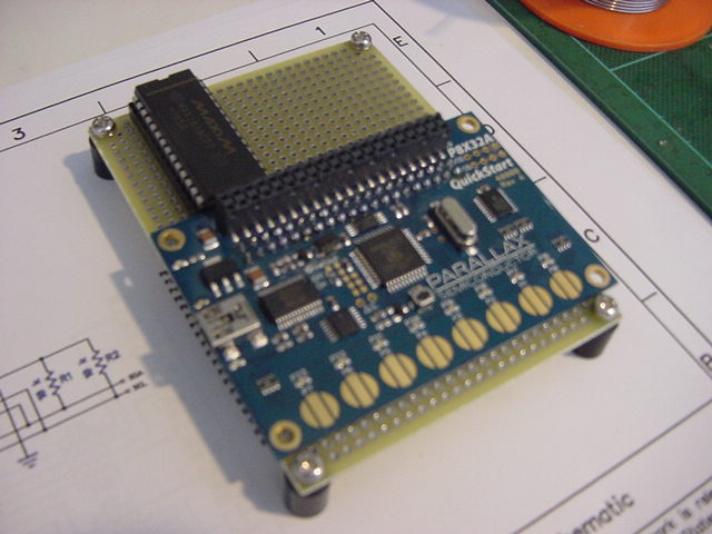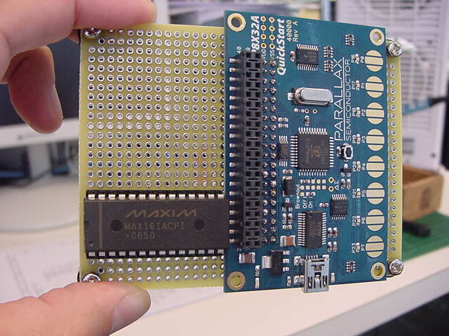 回路図PDFは既にあったので、あとは 購入元サイトの情報 の以下の情報を頼りに、実験とはいってもスタンドアロンで「使える」ものを作ることにした。 考えてみれば、汎用実験試作ボードに複数のマイコンを搭載し、その一つとしてPropellerがあるが、 そのためにMAX161の実験をする、その実験にPropQuickStartボード、という流れであるが、 えらい「寄り道」のようで、実は「Propeller日記」としては、また初めてのPropellerボードを使う、という、 まさに王道なのであった。 以下のように、敢えて小さいユニバーサル基板にPropQuickStartボードとMAX161とを載せて、 ここから高機能なシステムを実現してしまおう、という作戦である。
