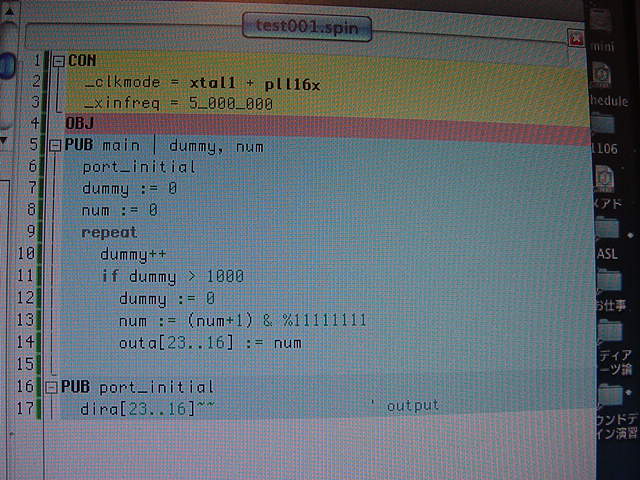 ユニバーサル基板にPropQuickStartボードとMAX161を載せて、まだ他に何も配線していない(^_^;)この状態で、 まずはこのPropQuickStartボードに馴れるために、ボード上のLEDを光らせることにした。 回路図から、ホストとUSBで接続していれば、オンボードの+3.3Vを作って電源供給はOKということで、 まずは以下のように、8個のLEDを8ビットバイナリで点灯させる、というお約束のプログラムである。 プログラミングはものの5分、あっさりと以下のように奇麗なブルーLEDイルミネーションが出来た(^_^)。 月曜はアカペラもあるので、まぁこんなところまでである。 LEDをPWM制御して連続値点灯する、というアセンブラのドライバを作るのもまだだったのを思い出した。 8個並んで抵抗だけ付いている「スイッチ」というのも、次にやってみることにしよう。 2012年10月30日(火)
