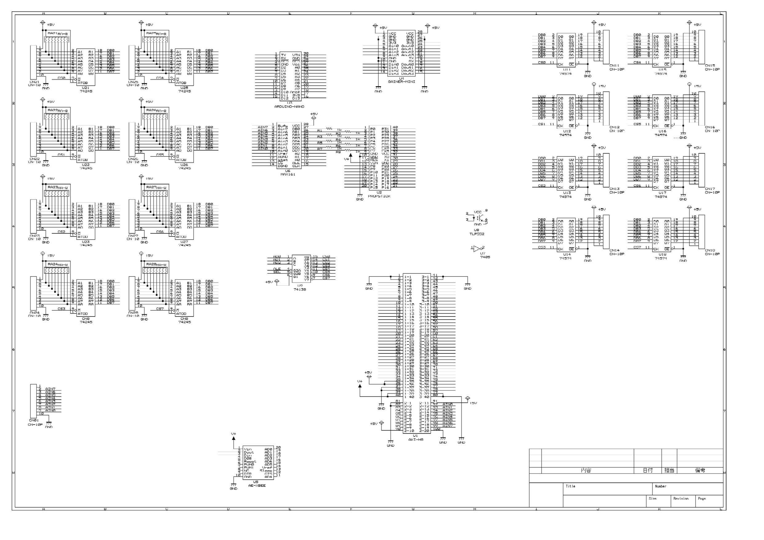 AKI-H8とPropellerとは、ほぼピンアサインが似た配置にすることが出来た。 Arduinoについては何と言ってもピンが少ないので、ちょっとトリッキーに多重化して、 ジャンパオプションを仕込む必要がある。 Gainerについてはピン不足はなおさらなので(^_^;)、これは他マイコンの回路が確定してから考えよう(^_^;)。