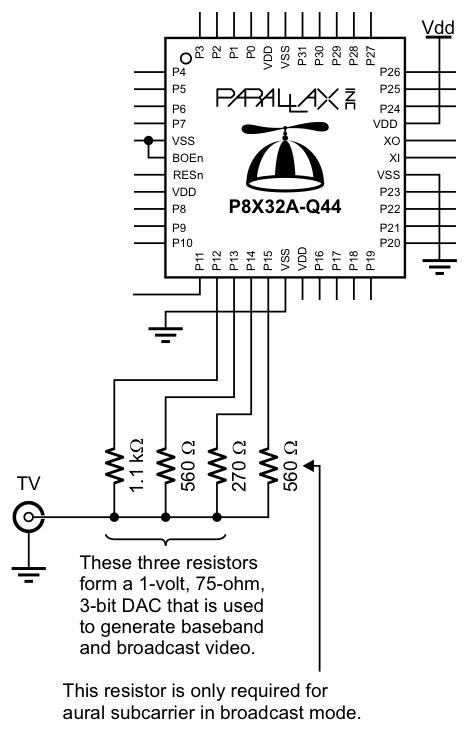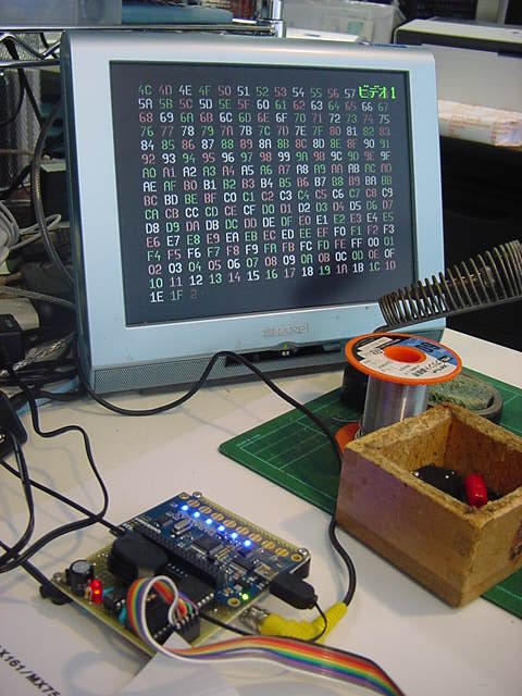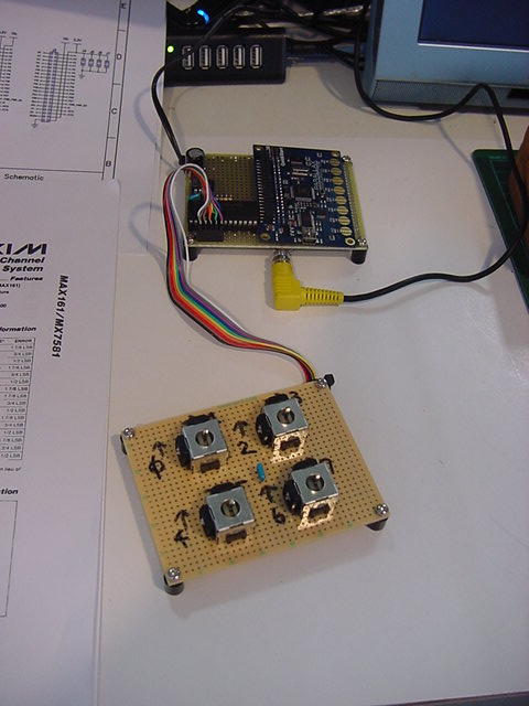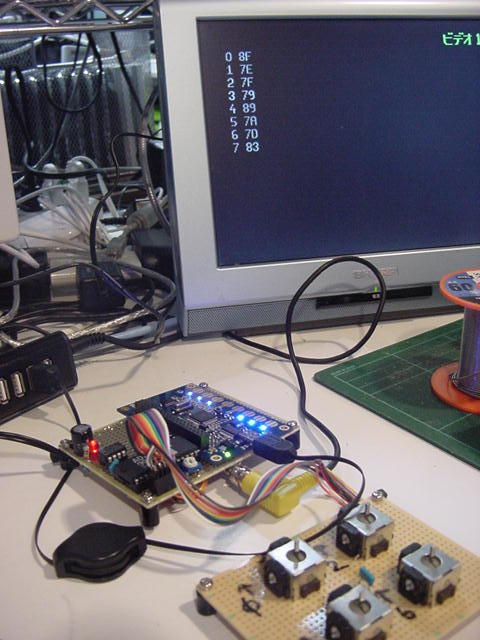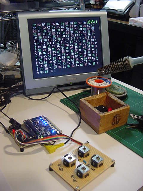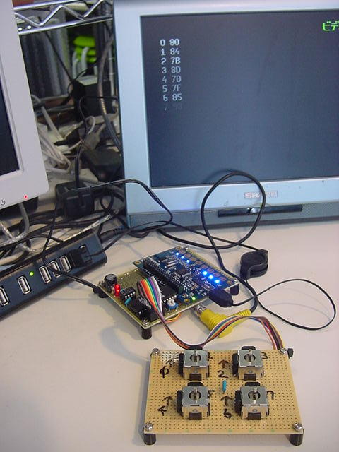 残るポートは「P0-P7」と「P24-P27」の計12ビットである。 これはちょっと悩ましい。 汎用入出力拡張ポートのアドレスデコードに3ビット、ラッチパルス用に1ビット、入力/出力の切り替えに1ビット、 計5ビットが必要である。 MAX161との間には、アドレスデコードに3ビット、ALEとCLOCKとで、たぶんやはり計5ビットが必要である 残るは2ビットだが、MIDIとXBeeとを混在させるなら4ビット、選択的に共用しても2ビット必要である。 これでピッタリ、と言いたいが、実は、あと3ビット、以下の「Video出力」のために欲しい、と思っていたのである。