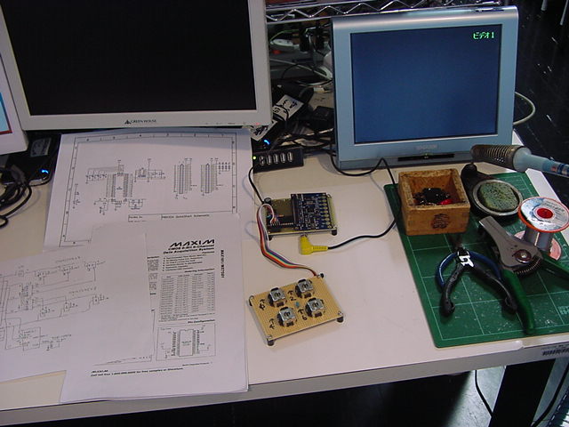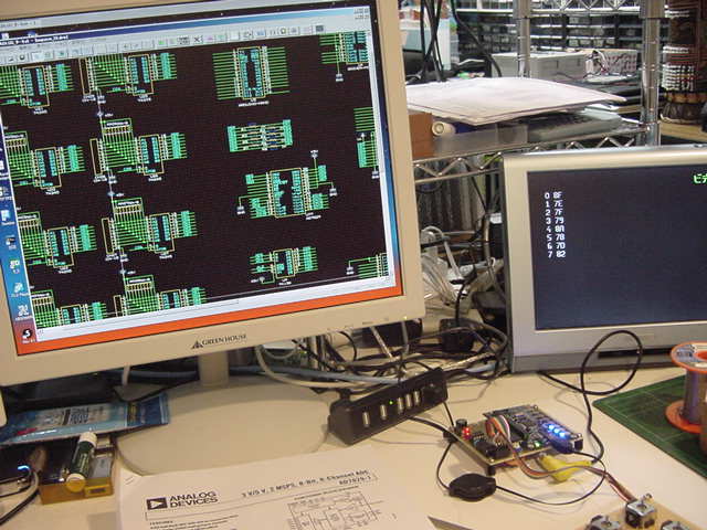 そしてあとはXBeeの回路、というところまで描いたところで業者がやって来て、 なんと速攻で、注文していた、ノーマルDIP(600mil)のA/Dコンバータ「AD7829」が届いた。 これは、バスラインの電圧レベル変換、そしてA/D変換の制御タイミングなどの確認のために、 回路設計をpendingしてでも、まずは実験してみたいところである。 Propellerから制御する部分の実験プログラムは、そのまま汎用実験基板でも使えるものとなる。 ・・・ここから3時間ほどで、以下のように、とりあえず8チャンネルA/D変換が出来た。 実際には、まだどこかに単純なバグがあって(^_^;)、入力チャンネルと表示されているチャンネル番号が1つだけズレているが、 まぁこれは後日、冷静になれば見つかるだろう。