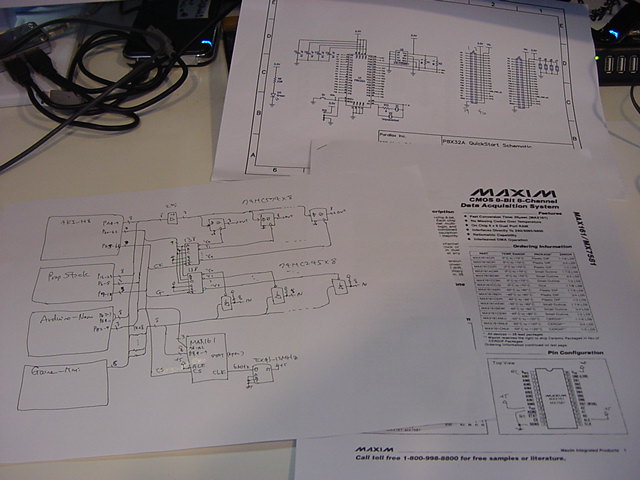 ここでしばらく考えて、システム図を改訂するとともに、Propeller周辺について整理した。 汎用入出力拡張ポートとして内部データバスで多重化しているが、Propeller用のMAX161にはCS端子があるので、 さらにMAX161もこのバスに多重化する、というアイデアに気付き、一気に構成が洗練されてきた(^_^)。