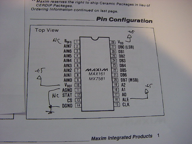 講義満載の怒濤の水曜日を経て、この日は半日ほど、MAX161と格闘した。 ALEを出したりアドレスを000に固定したり・・・と、可能性を全て当たったが、駄目だった。 MAX161を替えたり、VrefとVoffsetの接続など色々に試してみたが、どうしてもデータが得られない。 EX03からのクロックを下げたり、オシロまで出してCSなども調べたが、駄目である。そもそも、データシートに従って実験して、その通りに動かなかったチップというのは、 ちょっと記憶に無いのだが、実は このマニュアル は、ちょっとおかしいのである。 +5Vユニポーラのもっともシンプルな回路例が無いというよりも、 肝心のデータ部分で、ACタイミングの欄はほとんど矛盾のオンパレードである。 アクセスタイムとかセットアップタイムは、MINとTYPとが記述されていれば、 MAXの方はいくらでもいい・・・というのが普通だが、このマニュアルでは、 タイミング/クロック関係の全てのパラメータが「反対」である。 マニュアルのライタのケアレスミス、という理由は無理があるので、 なんだか「ヘン」なマニュアルなのだった。(^_^;)