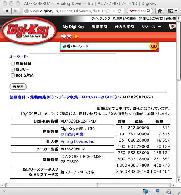 ここで一念発起して、また新たにYAHOO.COMに検索に出かけた。 ADC0808/0809とほぼ同等のスペックで、CMOSレベルのより新しいA/Dコンバータも出ている筈だ、 という予想からである。 そして遂に、「analog to digital 8channel 8bits CMOS」などと入れて、 同じAnalog Devices社から、 AD7829-1 というチップを発見した。 Digikeyで価格を調べると、以下のように1000円以下と良好である(^_^)。