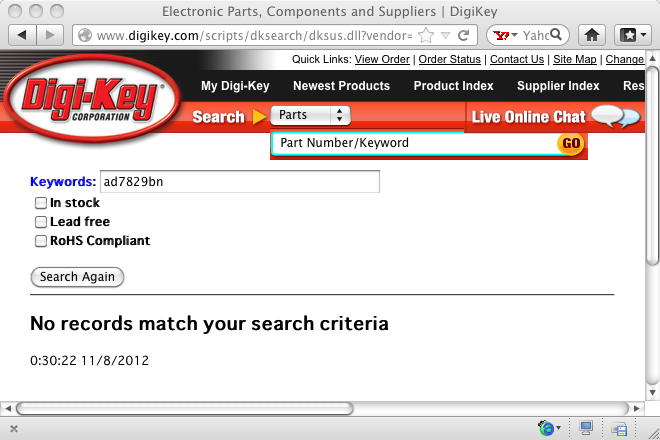 スペックを見てみると、ADC0808とは互換でないものの、ほぼ同等であり、電圧の問題もスレショルドの問題も解決されている。 コレだ! と、さっそくサンプルを業者に発注しようとさらに調べていると、なんと マニュアル の最後のページに、驚くべき情報を発見した。 このチップには、「600milのノーマルDIP」が無かったのである(^_^;)。 さすが、新しいチップでは、もはやノーマルDIPなど不要なのだろうが、これは困った。 そこでさらに検索していくと、同じAnalog Devices社から、 AD7829 というチップを発見した。 これは「AD7829-1」と違って、1/4/8ビットのA/Dのファミリであり、なんと マニュアル の最後のページを見ると、プラスチックパッケージに「600milのノーマルDIP」があった。 もちろん、電圧の問題もホストインターフェースのスレショルドの問題も解決されている。 ところが今度は、Digikeyでコストを調べてみると、DIPパッケージの「AD7829BN」については、 以下のように「取り扱っていない」のだった(^_^;)。