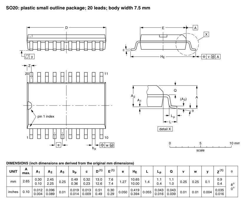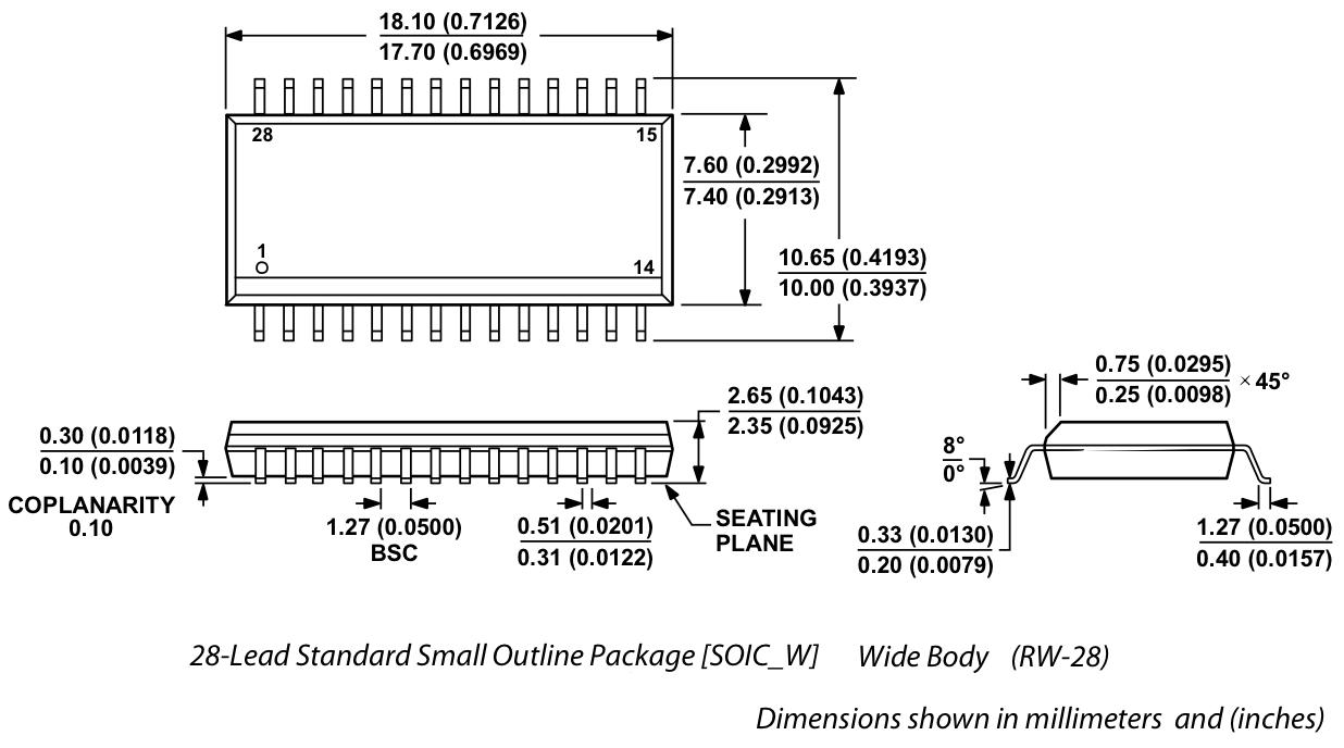 回路設計CADの上ではミニフラットパッケージ(300mil)もノーマルDIP(600mil)もまったく同等というのも、 まぁ当たり前ではあるが、考えてみると面白い。 ミニフラットパッケージの図面が必要になるが、これはどこからでも入手できる。 とりあえず、A/Dの「AD7829-1」「AD7829」は電気的にはほぼ同じなので、 0.65ミリピッチの「28-Lead Thin Shrink Small Outline Package [TSSOP]」はちょっと怖いので(^_^;)、 0.5インチ(1.27ミリピッチ)の、 以下の「28-Lead Standard Small Outline Package [SOIC_W]」を使うことになる。