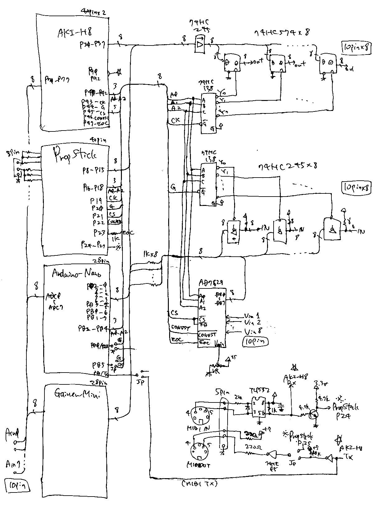 そして、午前中をかけて過去の「Propeller日記」を読み返しつつリンクバグを修正して、 午後になってここは一度、キチンと回路図を描いて・・・ということで、 かなり時間をかけて以下のように描いてみた。