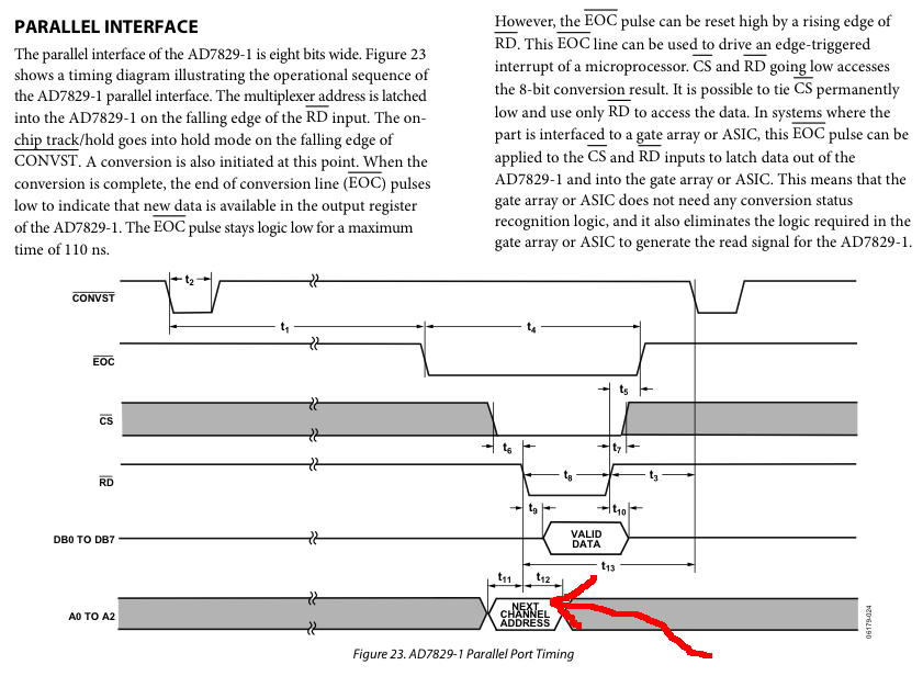 水曜日は講義満載でPropellerは進まない筈であるが、つかの間の3限に進展した(^_^)。 またまた夜中にフト目覚めて、そこで思い出した事があり、布団の中で解決していたのである。 残像のように頭に残っていたのは、以下のAD7829のタイミングチャートであった。つまり、A/DデータをPropellerに読み込むためにRD/CSを下げる時に、 一緒に出しているセレクトアドレスは、その読み出しアドレスの「次」だったのである。 これが、前日、ズレていた原因である。 そしてもう一つ、EOCをモニタしている足踏みルーチンだが、 極性が逆のようで気になっていたが、実はこれは、A/D変換が猛烈に速いので、 実質は不要なのではないか、というアイデアだった。