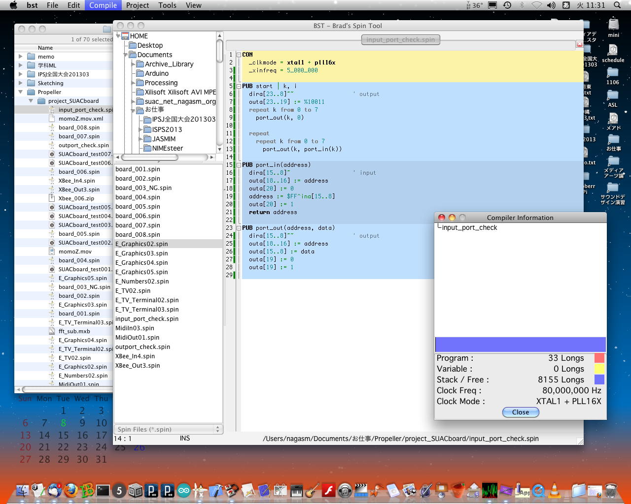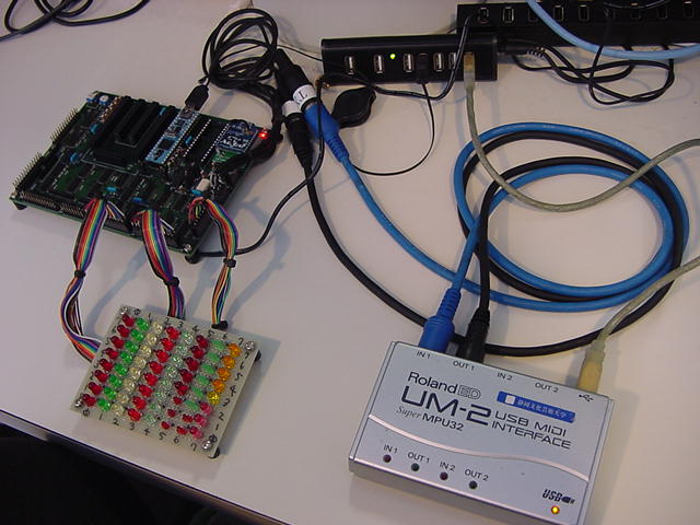 まず最初に、昨日のLED出力Propellerプログラムに、それ以前に開発したMIDIの送受信を加えて、 「MIDIから64個のLEDを個別にON/OFFする」というプログラム「board_008.spin」を作ってみた。 MIDIプロトコルだとデータが7ビット幅なので、OLEDモジュールの時と同様に、 1ポート8ビットのデータ形式には無駄が出て来るが、まぁLEDの点灯であれば、人間の視覚のレイテンシの方が大きいので、まったく問題ない。 これは過去に、メディア造形学科の学生インスタレーション作品でいくつも実現してきたものと同等であり、 今後、このSUAC基板を使えば、これもかなり簡単に実現できることになる。