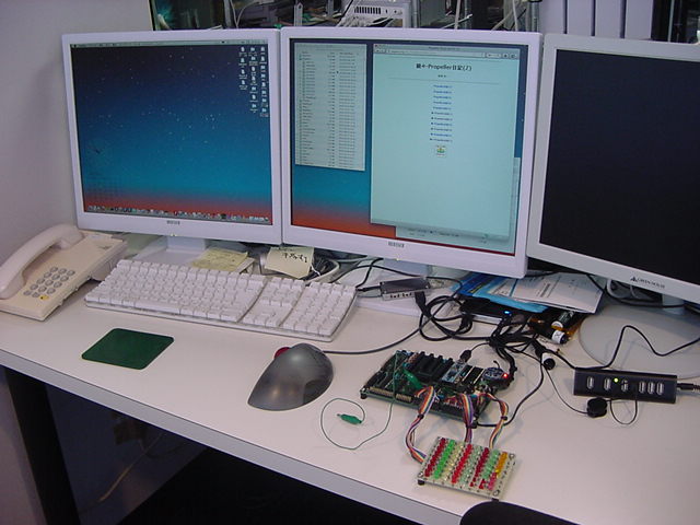 見崎さんのプレゼンFLASHでは、4つのマウスからPC(Flash)に接続するインターフェースが「Gainer」となっているが、 実はとても地味ながら、ここにPropellerが活躍しているのであった。 4つのマウスはUSBマウスではなくて、懐かしい「シリアルマウス」である。 4個のマウスとシリアル通信してそれぞれの操作情報を取得して、 それをホストに送る、という処理は、まさにPropellerにうってつけである。 マウスとのシリアル通信は、それぞれのCogsに任せればいいので、割り込みも不要である。