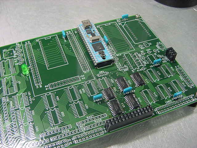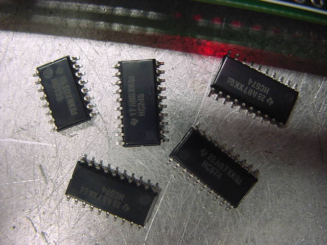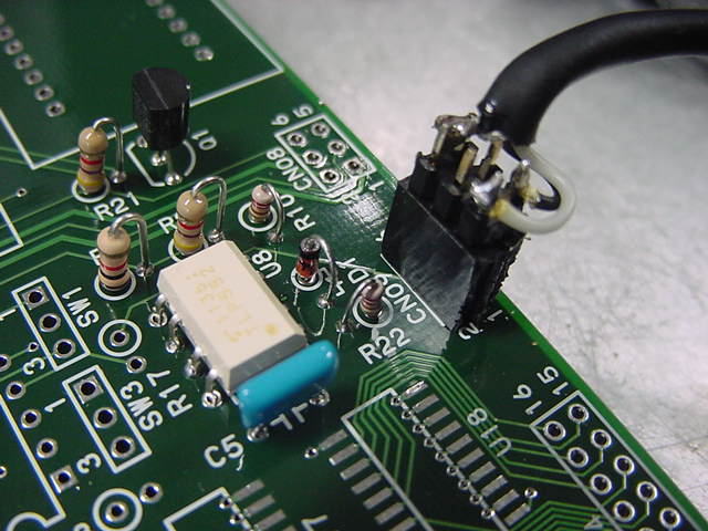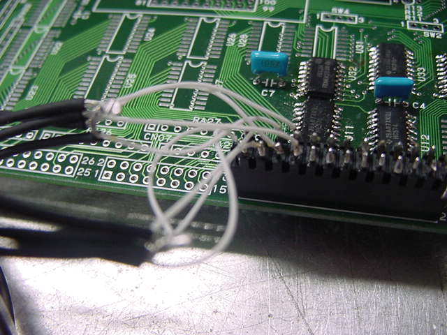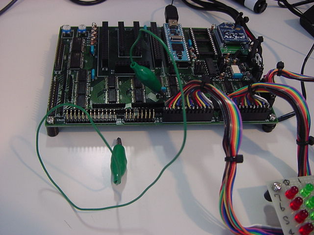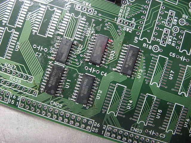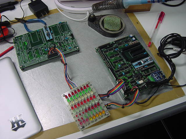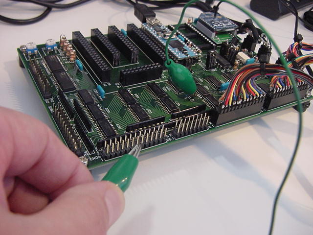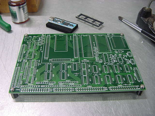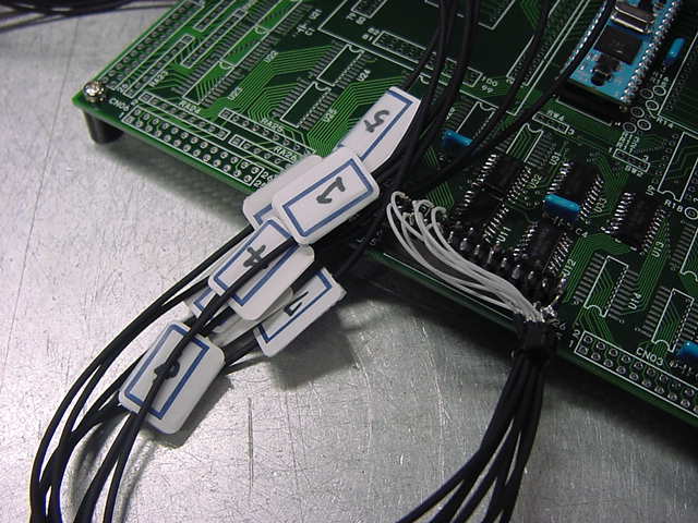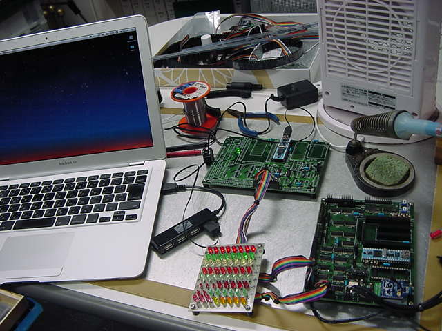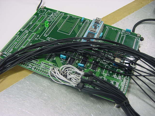 治具が完成し動作が確認できたパラレル出力ポートで、 PropellerアセンブラによってPWM制御するライブラリの開発、という大ネタは、まだ先である。 しばらく寝かせておきながら、アルゴリズムを無意識下に検討していきたい。 となれば、次は「パラレル(ディジタル)入力」の拡張機能部分のチェックである。 これは最初から、以下のようにGNDとショートするワニグチクリップによって、 端子を次々と触っていったところをチェックする、という方針が決まっていた。 そのために、コネクタもオスにして、電極が露出するようにしたのである。■SUAC board ver.0.5からの改善点リスト■ ●バグなので次バージョンで必ず改訂する項目 ・XBeeのDinとDoutが逆(^_^;)なので入れ替える ・2個の138のG入力の2本にpull-up抵抗が必要 ・↑そのpull-up先の電圧を+5Vとするか+3.3Vとするか、のジャンパが必要 ・2個のAD7829の出力イネーブル(CS/RD)の2本はpull-down抵抗が必要 ●必須ではないが改訂することになれば盛り込みたい項目 ・電源コネクタ ・電源給電表示LED ・半固定抵抗の穴を2mmφにする ・半固定抵抗の中央穴の位置を0.1インチ離す ●現行SUAC board ver.0.5の増産時に対応すること ・XBeeのDinとDoutが逆なので基板配線面をカットして修正する ・CS1/CS2(2個のAD7829の出力イネーブル(CS/RD))を4.7kΩでpull-down ・2個の138のG入力の2本に4.7kΩのpull-up抵抗 →そのpull-up先の電圧はホストに対応して+5Vまたは+3.3V ●その他メモ上の写真は作業の前に撮ったヤラセの写真であり(^_^;)、まだ何も起きない。 ちょうどLEDボード治具が出来たので、今回はMIDIもXBeeもビデオ出力もナシで、 入力の64ビットの状態をこのLEDの64ビットで表示する、というシンプルな動作にしてみよう。 プログラムとしては、既に作った「outport_check.spin」を改良して、 スタンドアロン動作の「input_port_check.spin」というカンジになる。 ただし、拡張バスは入力と出力とを刻々と切り換える、という、内部的には高度な動作である。
