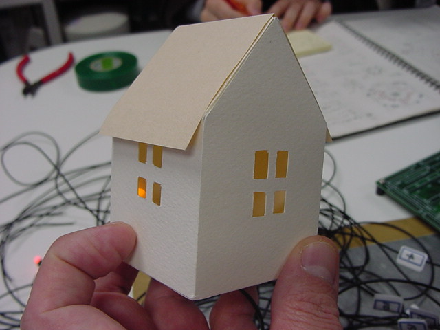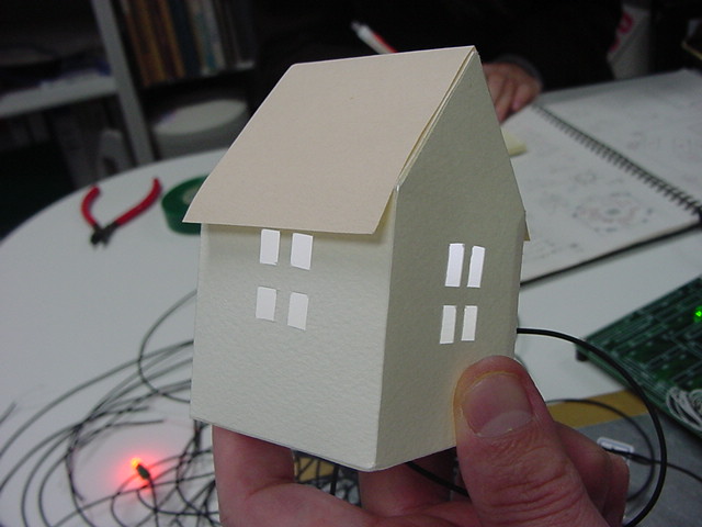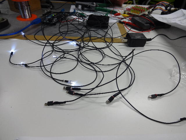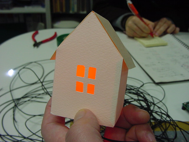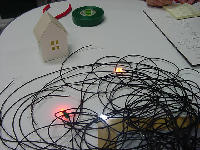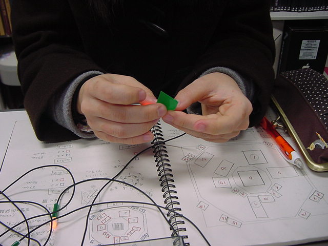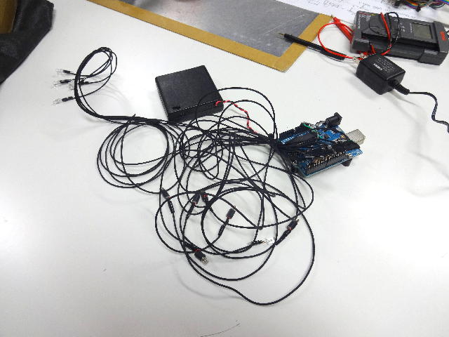 ・・・そしてこの後、3回生の藤本さんが来て、総合演習Iで企画しているインスタレーション作品について相談した。 自宅でArduinoとかを本を頼りに勉強しているということで、1個のLEDを点灯させるまでは行ったとのことで、 いろいろと相談して、6個の白色LEDをPWM点灯させ、さらに6個の振動モータをArduinoで制御する、 という方針が決まった。 そして約3時間半、以下のように一気に完成したものを渡したところでオシマイとなった。 なかなか充実の一日である。(^_^)