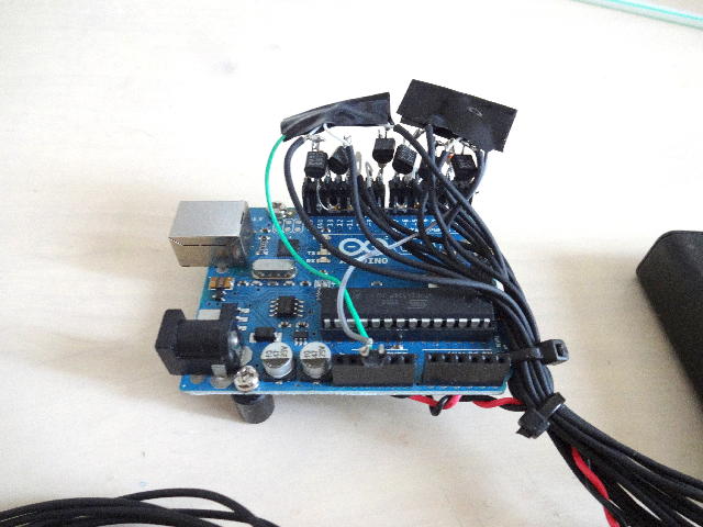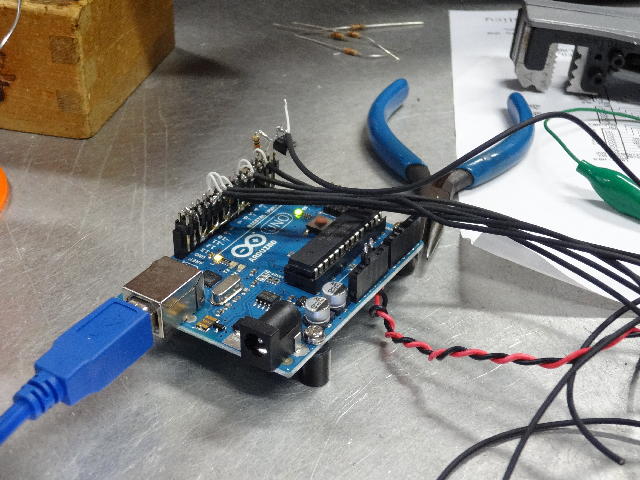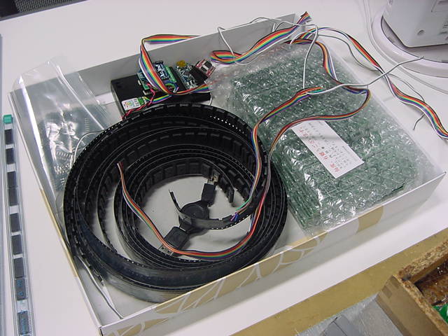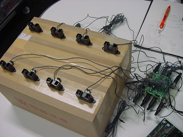 ・・・と考えてみて気付いたのが、今回のSUACボードである。 MIDIも受けられる、そして64ビットまでのLEDを個別に調光制御できるように、PWMライブラリが完成したところだった(^_^)。 これはもう、ソレしかない、という事で、急転直下、SUAC基板の作品への応用の初事例が、この望月作品という事に決定した。 そして、とりあえずシャープの距離センサを段ボール箱に並べて、以下のように作業場が出来た。