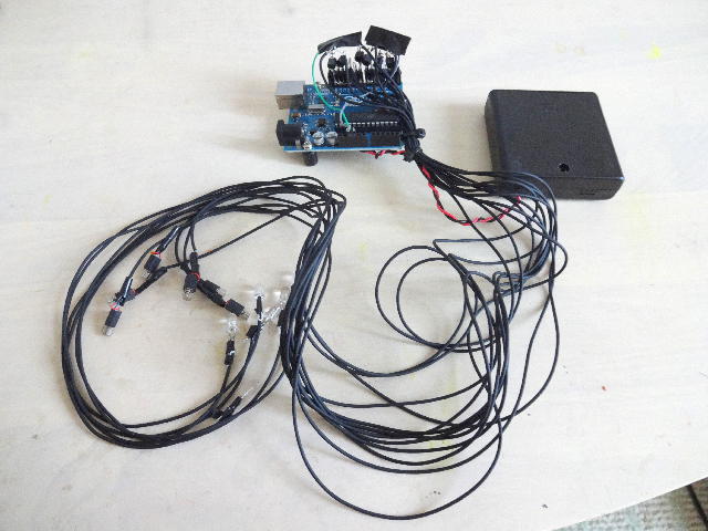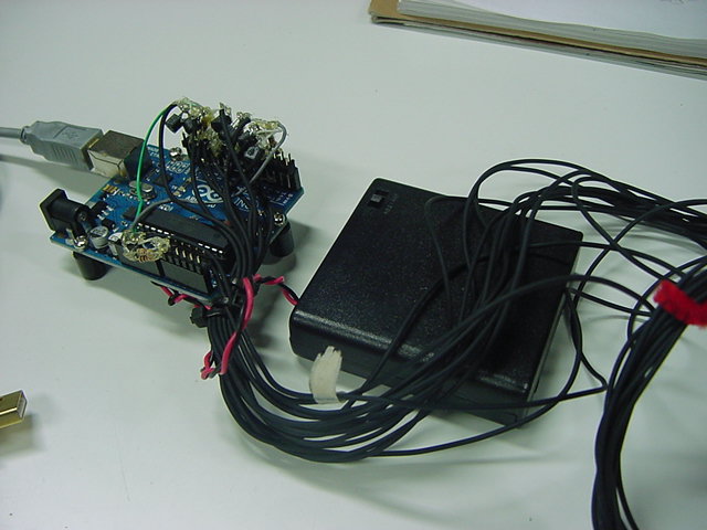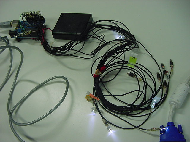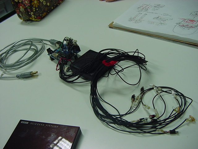 そして今日は、3回生の藤本さんが再びのアポで来訪して、以下のようにインスタレーション作品のシステムとして仕込む、 6個の白色LEDと6個の振動モーターと2個の照度センサ(CdS)を接続したArduinoのプログラミングを行った。