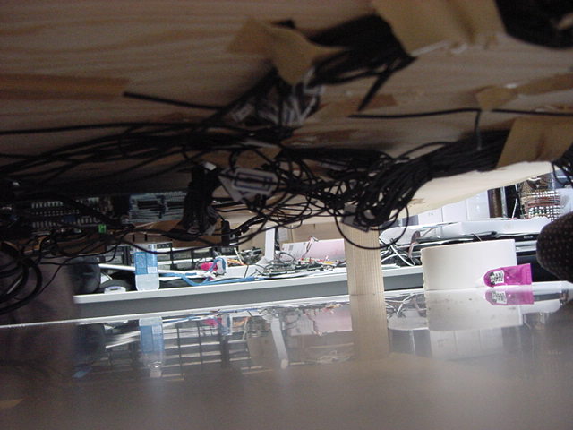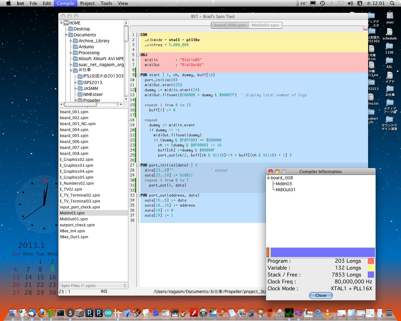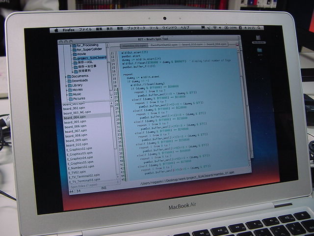 IRIXのMIDI処理のように、MIDIドライバから本格的に書き換えて、MIDIイベントにシステムのタイムスタンプまで添えた形にすれば、 おそらくPropellerでも「1秒の遅延」は実現できる可能性があるが、とても今回は間に合わない、という事である。 いずれの課題として、ここは作品展示の際には、台の下にノートパソコンを折り畳んで内蔵する形としてもらう事にした。 以下が記念すべきそのPropellerプログラム、つまり今回のSUACボードが作品に使用される第一号のプログラムである。