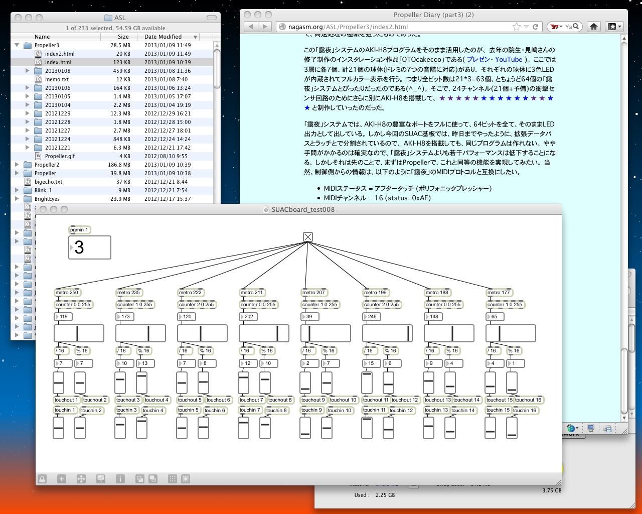 遂に「続々」のPropeller日記もpart2になってしまった。 SUAC基板が届いた12/21に part1 を始めたので、まさに part1 は年末年始をまたいだところである。 果たして「続々」でどこまで行けるのか、ちょっと楽しみである。昨日はM2の伊熊さんの修了制作の検収が終わり、次は口頭試問である。 その日程調整や会場となる瞑想空間の予約、さらに2年目に入る学部長特別研究の申請と、 明日の講義再開を前にして、事務仕事も増えてきた。 アルスエレクトロニカ2013の作品募集案内も届いた。参加することに意義がある(応募すると後日にDVDが届く)、 と毎年応募しているからである。とりあえず今回は、MOM2012で発表した作品を応募しよう。 今日の午後には3ヶ月に一度のクスリを貰いに医者に行ったり、3回生の藤本さんの相談アポもある。 コマ切れの一日となりそうだが、コマ切れなりにPropellerも進めたい。 昨日の結果を受けて、次回版の基板に向けての申し送りメモは以下のようなっている。