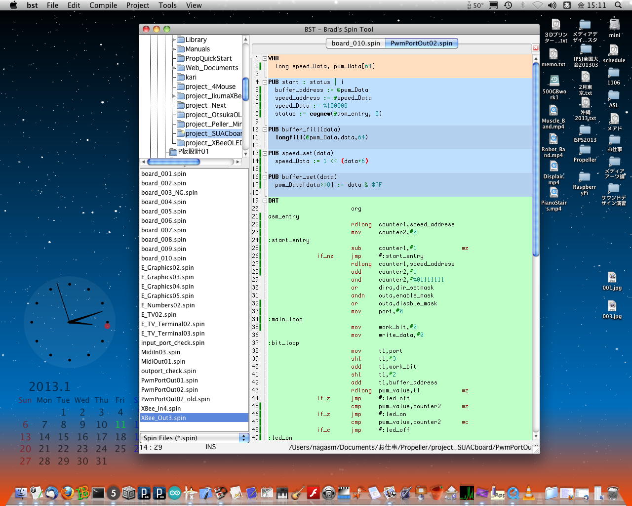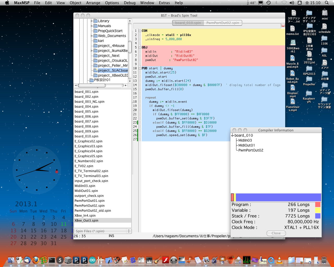 ・・・などと眺めているうちに、次第にPropellerアセンブラの雰囲気が蘇ってきた。 CPUについては「覚えない」、頭をRAMにする、という主義の本領発揮で、このカンジは、なかなか気持ちいいものである。 ただし、実験的にコンパイルしてみると、おそらく怒濤のエラーが出て来て難儀・後悔するのである(^_^;)。 そこで、上のバージョンは今後の失敗退却に備えて(^_^;)残しておくことにして、 「board_009.spin」をコピー・リネームした「board_010.spin」がメイン、 そして「PwmPortOut01.spin」をコピー・リネームした「PwmPortOut02.spin」を作った。 また、ホストのMaxの「SUACboard_test008.maxpat」をコピー・リネームした「SUACboard_test009.maxpat」を作った。