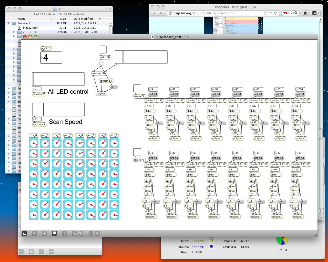出来てしまえば何でもないが、ここまで来るには色々と試行錯誤して、次第にPropellerアセンブラが蘇ってきた。 結論としては、ホストのMacから制御するMaxパッチもちょっと気合いを入れて頑張って、 AKI-H8で作ったシステムよりも、はるかに協力で柔軟な性能を実現してしまった。 以下のYouTubeでは、その機能をデモした様子を紹介している。