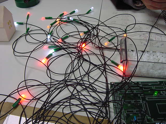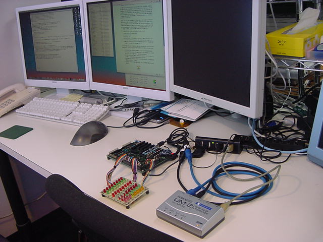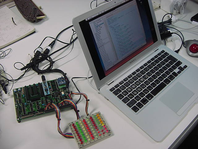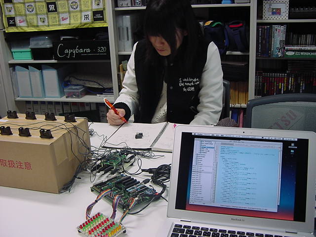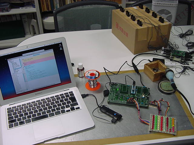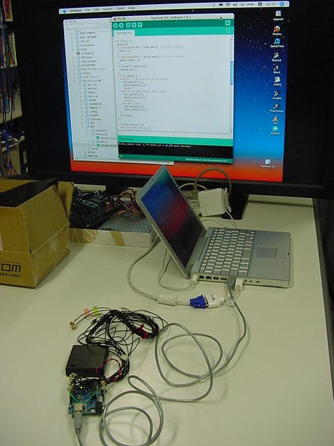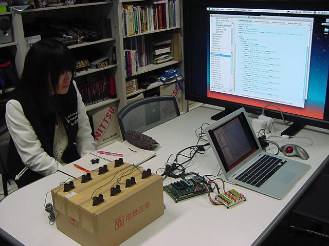 この日は学生からのちょっとしたアポが3件ほどあったが、まずまず研究室での作業が進んだ。 昼休みには事務局に行って、ちょっと嬉しい知らせが届いたが、これもお披露目は新学期である。 デザインフェスタのワークショップに関する、講師の小林さんとのやりとりなどもメイルで数往復、進んだ。昨夜も夜中にフト目覚めて、問題点をメモして攻略指針は立っていたので、さっそくプログラミングに取りかかった。 ・・・そして遂に、昨日から持ち越していたバグも取れて、無事に「64ビット個別PWM制御」は完成した。 以下はその模様である。